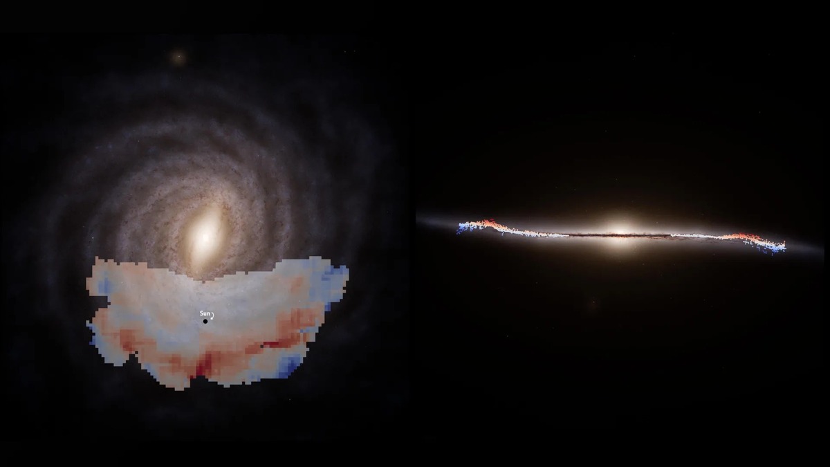 In the image on the left, we see our galaxy from a top-down perspective. The right panel shows a side view, cutting vertically through the galactic plane. From this angle, the left portion of the galaxy curves upward while the right side bends downward (this is the warp of the disc). The red and blue regions mark the newly discovered wave: red areas indicate stars located above the warped plane, while blue areas show stars lying below it.