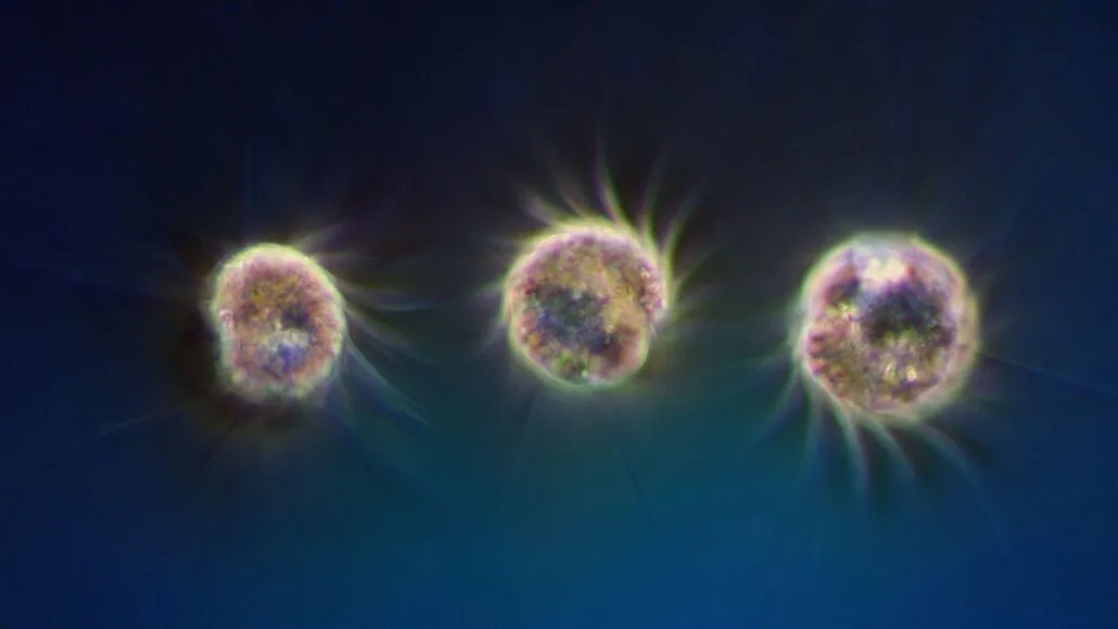 In laboratory experiments, Halteria that were living in water droplets and given only chloroviruses for sustenance reproduced, ecologist John DeLong and colleagues found.