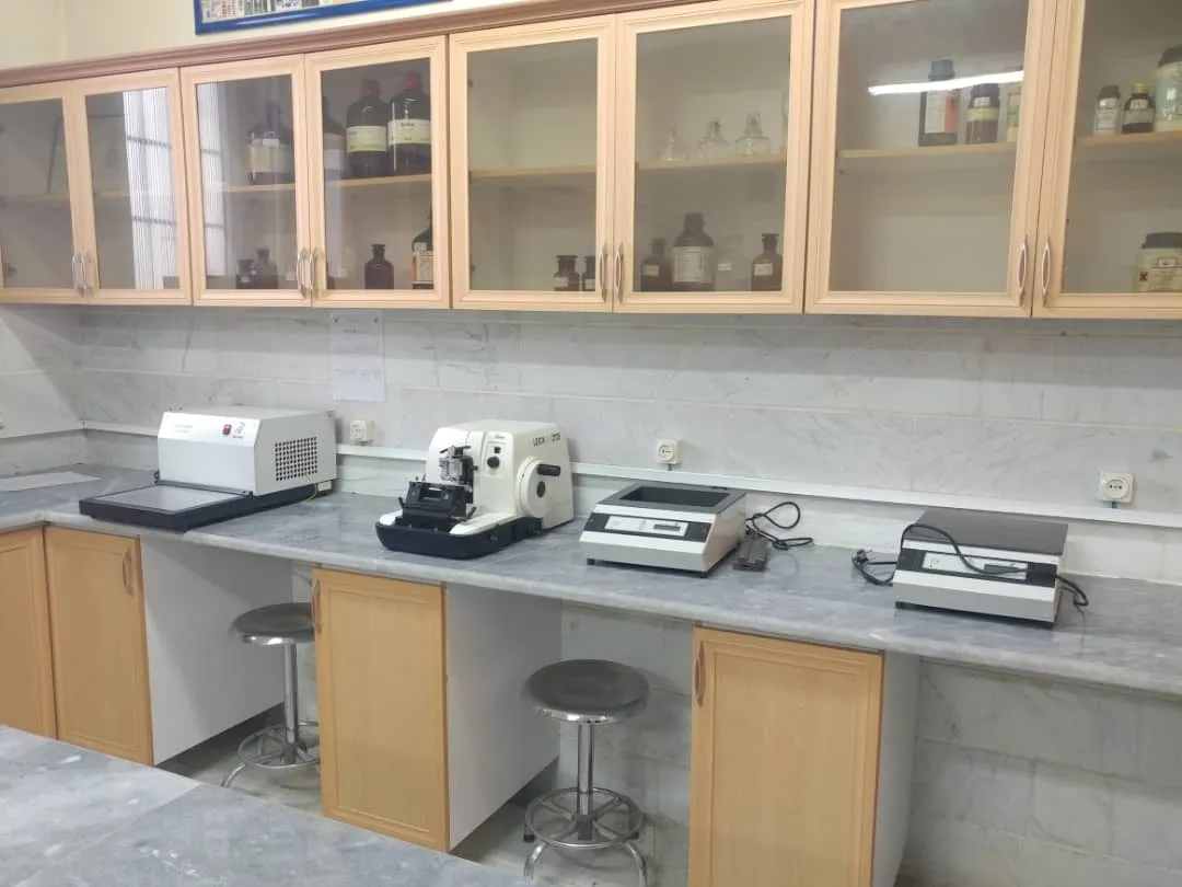 The laboratory is equipped with devices such as a tissue processor, paraffin dispenser, tissue float, cold plate, hot plate, microwave, stereomicroscope, research digital microscope, and slide dryer that are required for histological methods.
