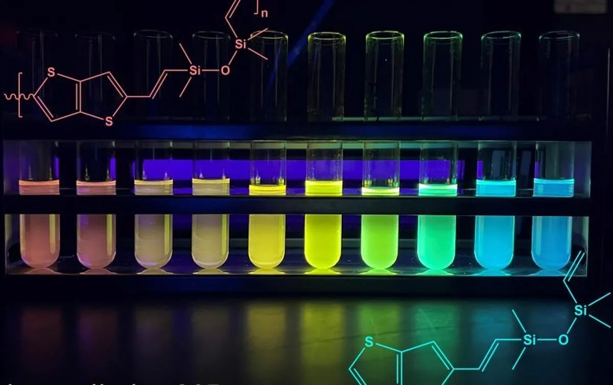 To demonstrate the connection between chain length and light absorption and emission, the researchers separated copolymers with different chain lengths and arranged them in test tubes from long to short. Shining a UV light on the tubes creates a full rainbow as each absorbs and emits the light at different energies.