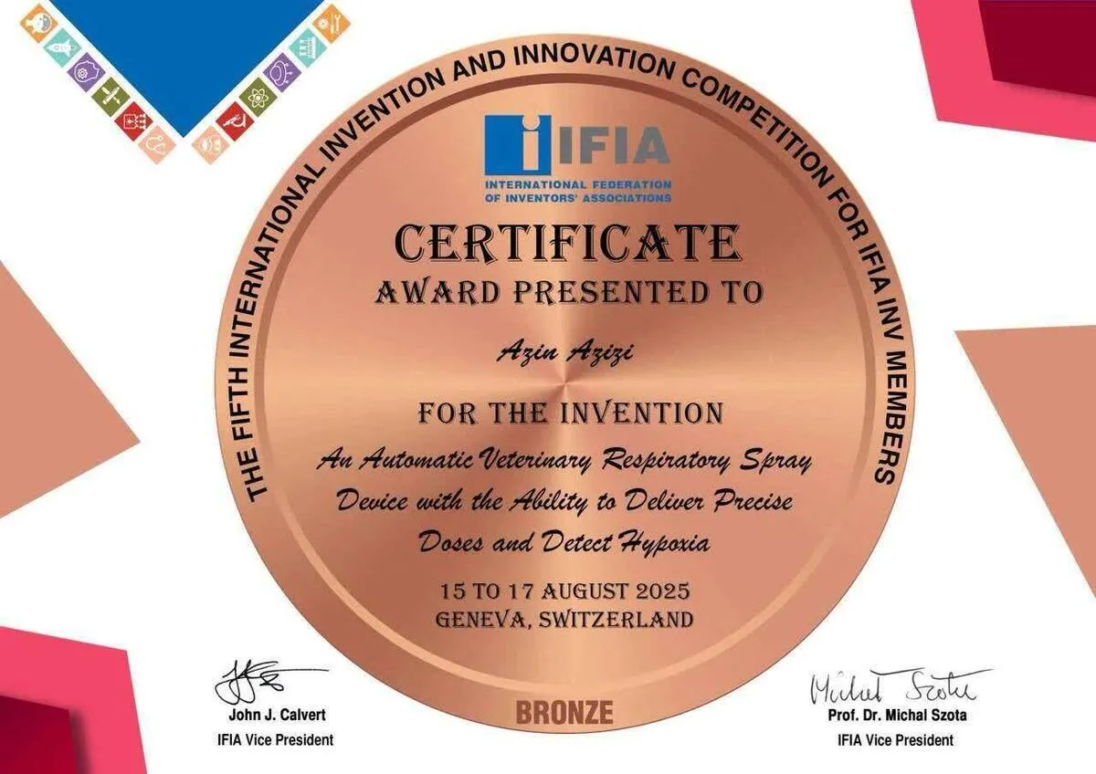 Azin Azizi, a final-year PhD student in veterinary medicine at Islamic Azad University’s Karaj branch, won a bronze medal at the 2025 World Inventors Competition in Geneva, Switzerland, with the idea of designing an automatic respiratory spray capable of delivering a specific dose of medicine and detecting hypoxia.
