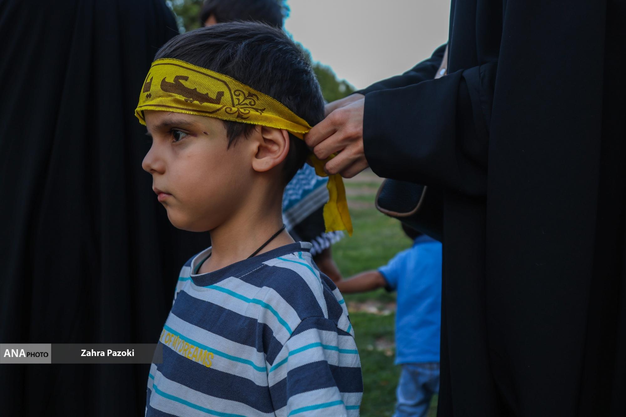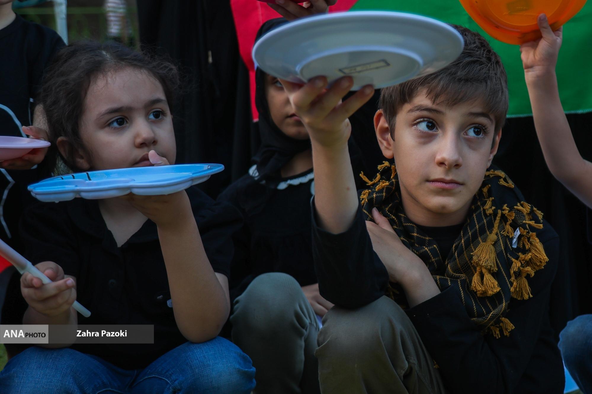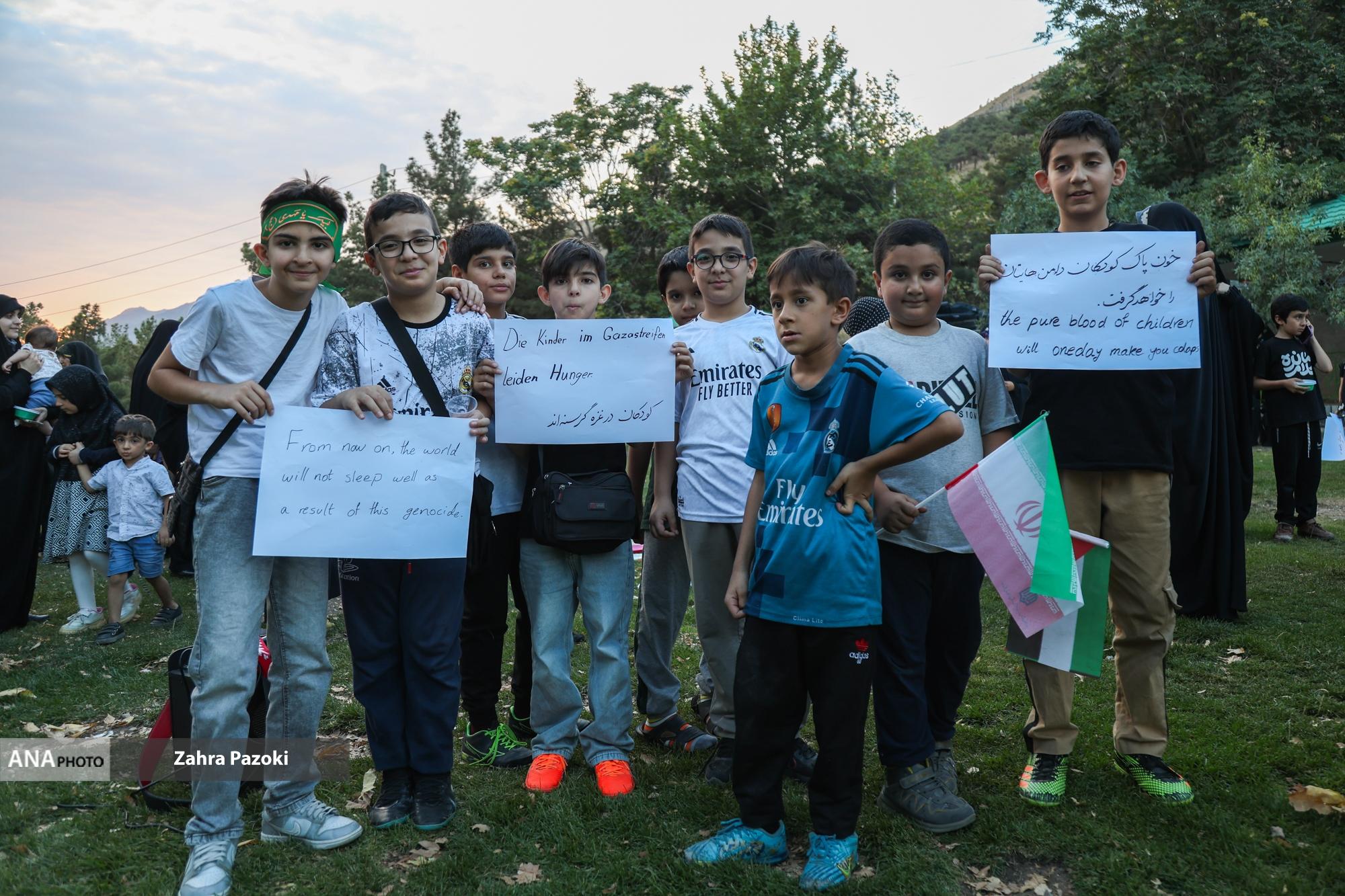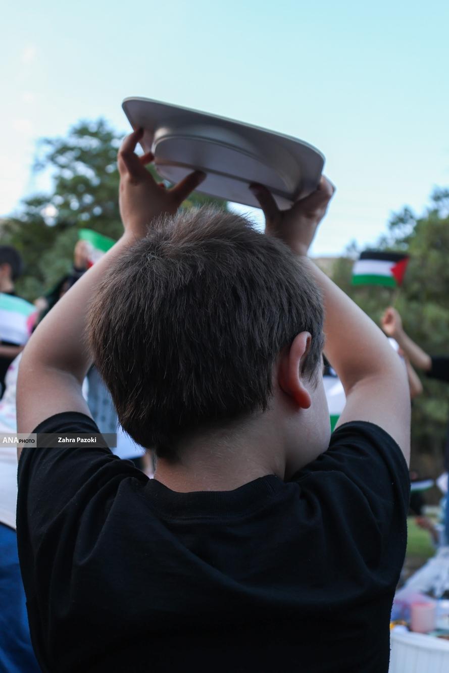 جمعی از مادران با ظرف های کوچک غذای کودکانشان برای نجات غزه با عنوان (ایستاده برای نجات غزه) در زمین چمن ارتفاعات شهرک شهید محلاتی تجمع خودجوش برپا کردند.