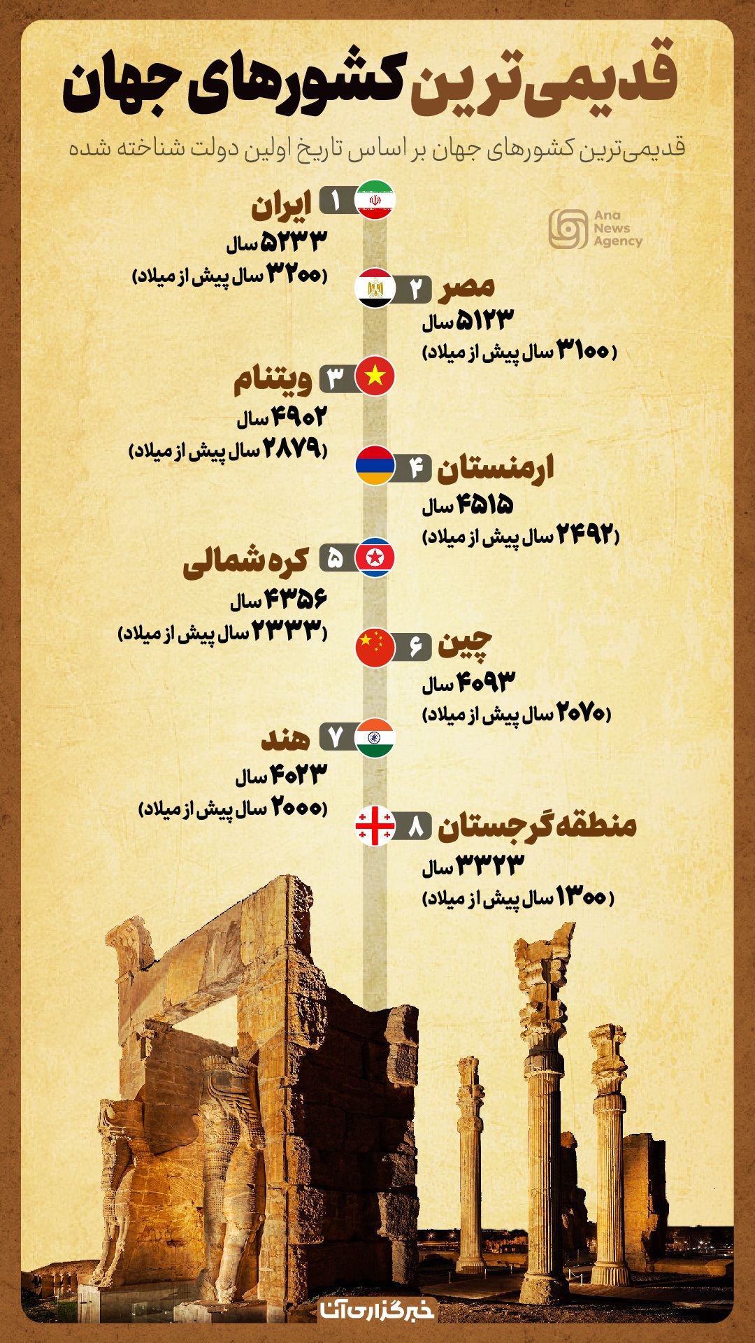 تعیین سن یک کشور همیشه کار سادهای نیست. به ویژه در مورد کشورهای قدیمی، دشوار است که لحظهای در تاریخ را مشخص کنیم که آن کشور به طور رسمی آغاز شده باشد. اما به نظر کارشناسان، ایران در رتبه نخست کهنترین کشورهای جهان قرار دارد.