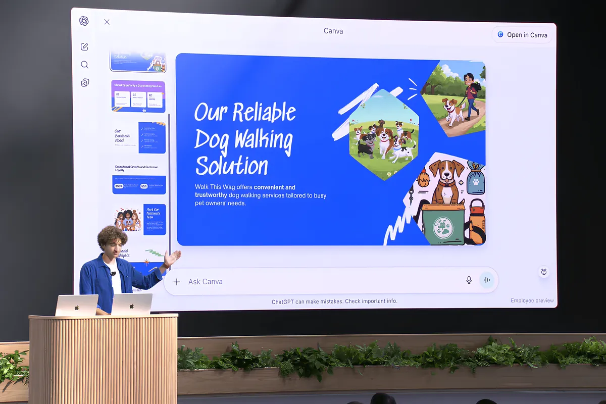 در دموی زندهای که برای نمایش این قابلیت اجرا شد، این امکان به صورت عینی توسط بینندگان مشاهده شد. اپلیکیشن طراحی کانوا که درون چتجیپیتی فراخوانی شده بود، به درخواست کاربر برای طراحی یک پوستر تبلیغاتی برای یک در مدت زمان کوتاهی پاسخ داد و پوستری با تصاویر و متن مناسب طراحی کرد. در ادامه، کاربر درخواست یک فایل ارائه برای جذب سرمایهگذار کرد و کانوا با استفاده از همان اطلاعات و هویت بصری پوستر، یک ارائه حرفهای و کامل را در چند ثانیه آماده کرد. این فرآیند، که پیش از این نیازمند ساعتها کار بین چند نرمافزار مختلف بود، اکنون در یک محیط واحد و در عرض چند دقیقه انجام شد.