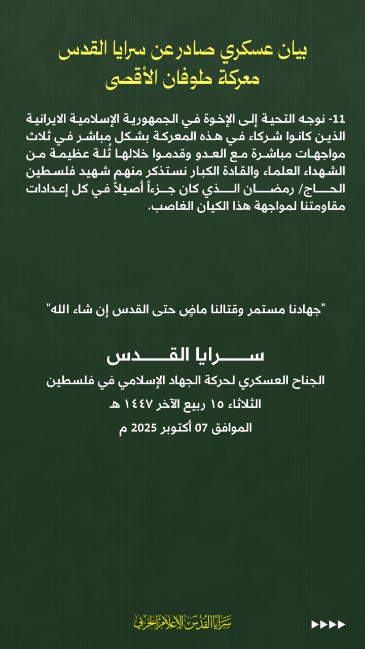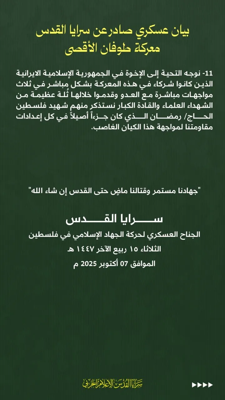 ۱۱. درود بر برادران ما در جمهوری اسلامی ایران که بهصورت مستقیم در این مبارزه در سه تقابل مستقیم با دشمن شریک بودند و در این مسیر گروهی از شهدای بزرگی را — از جمله شهید «فلسطین حاج رمضان» — که بخش جداییناپذیری از تجیهزات مقاومت ما برای رویارویی با این موجودیت غاصب بودند، تقدیم کردند.