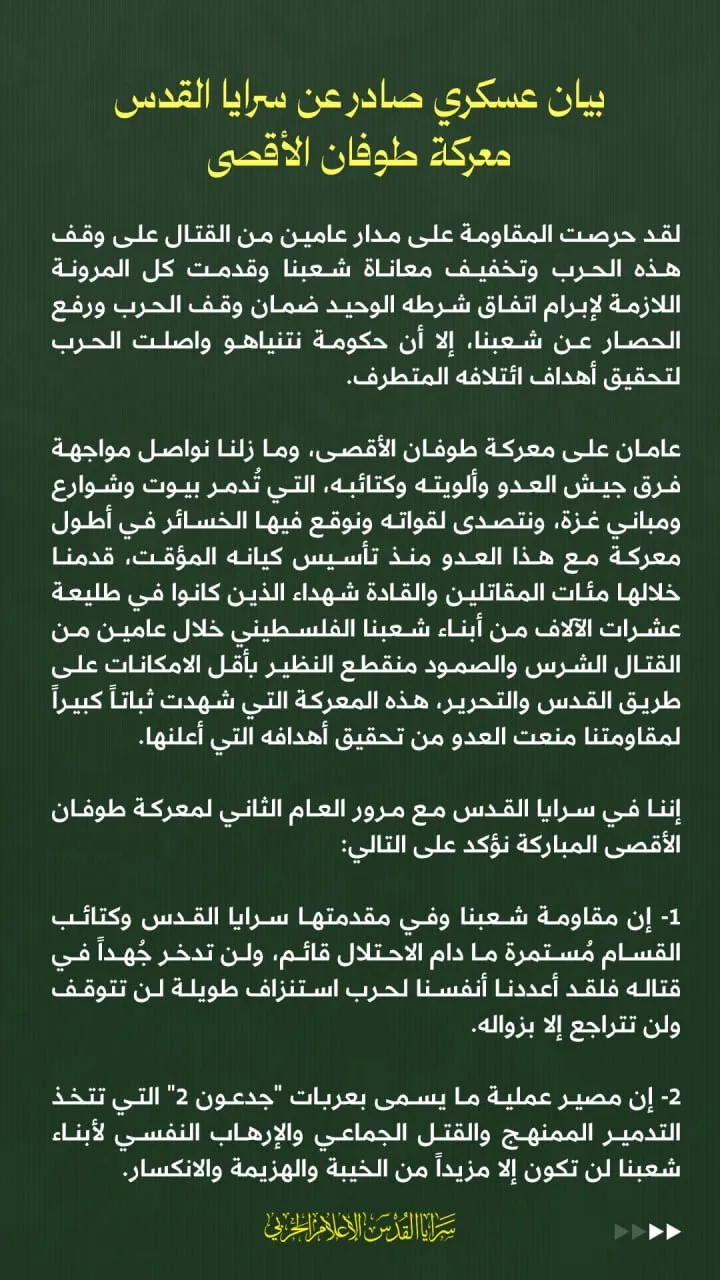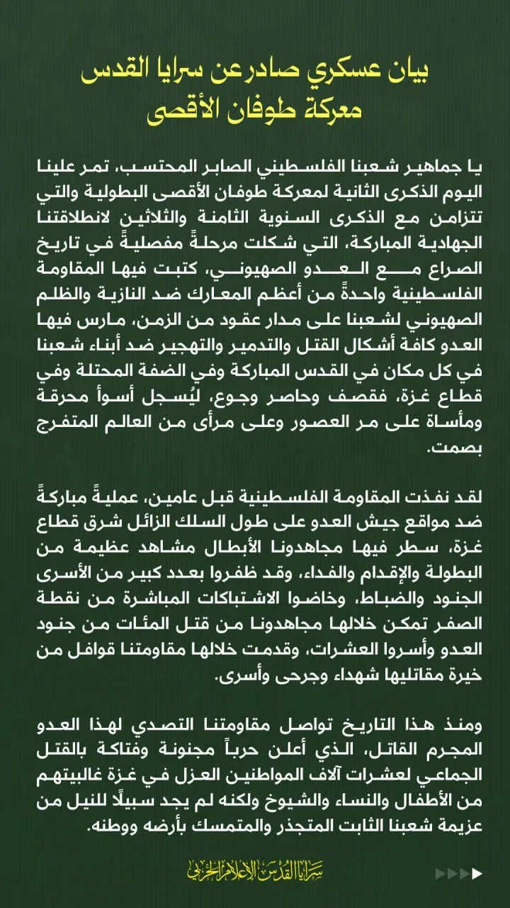 بیانیهٔ نظامی صادر شده از سوی سرایا القدس