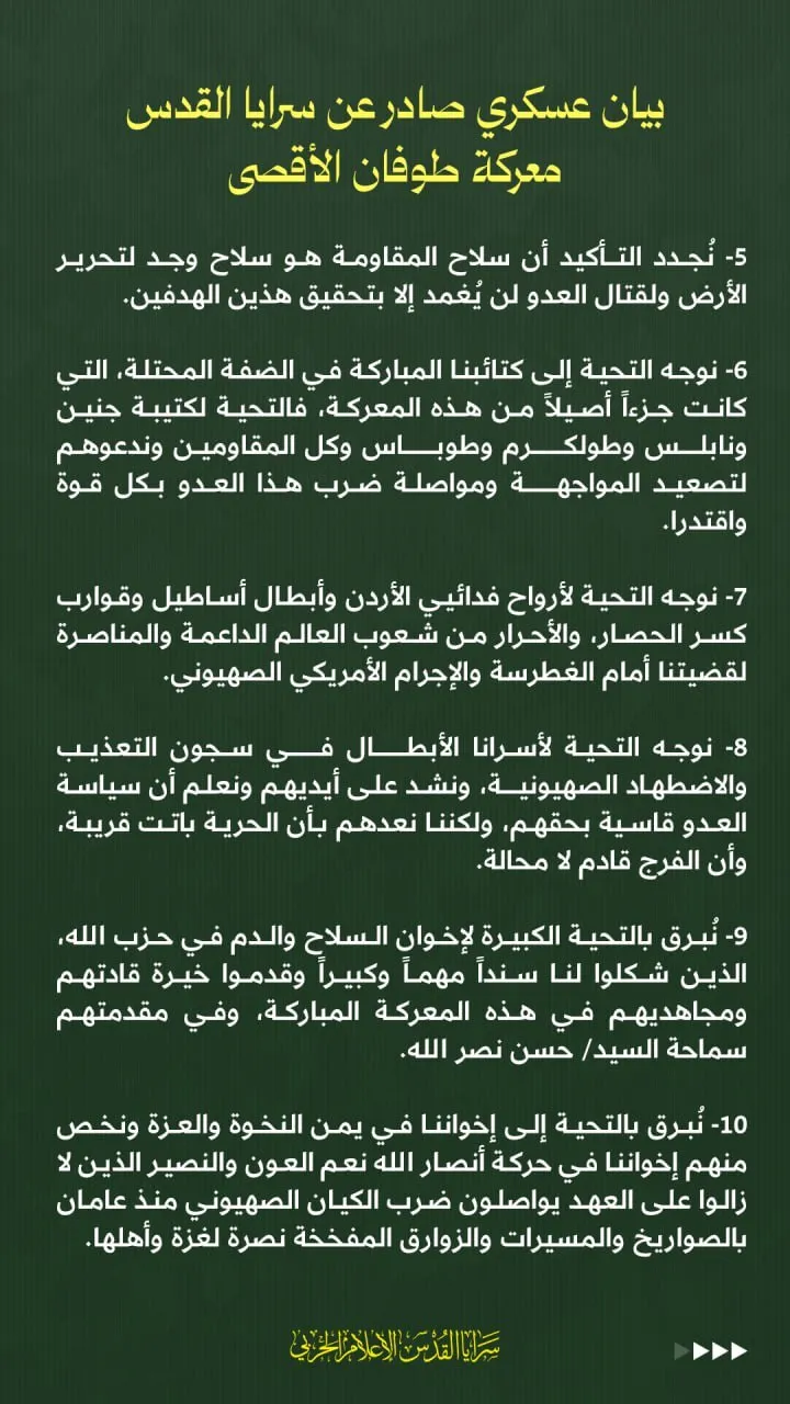 ۶. درود بر گردانهای مبارز ما در کرانهٔ باختری که بخش جداییناپذیری از این نبرد بودند — درود بر گردانهای جنین، نابلس، طولکرم، طوباس و کلیهی مقاومین — و از آنان میخواهیم که در شدت نبرد و ضربات علیه این دشمن تداوم و تشدید ایجاد کنند.