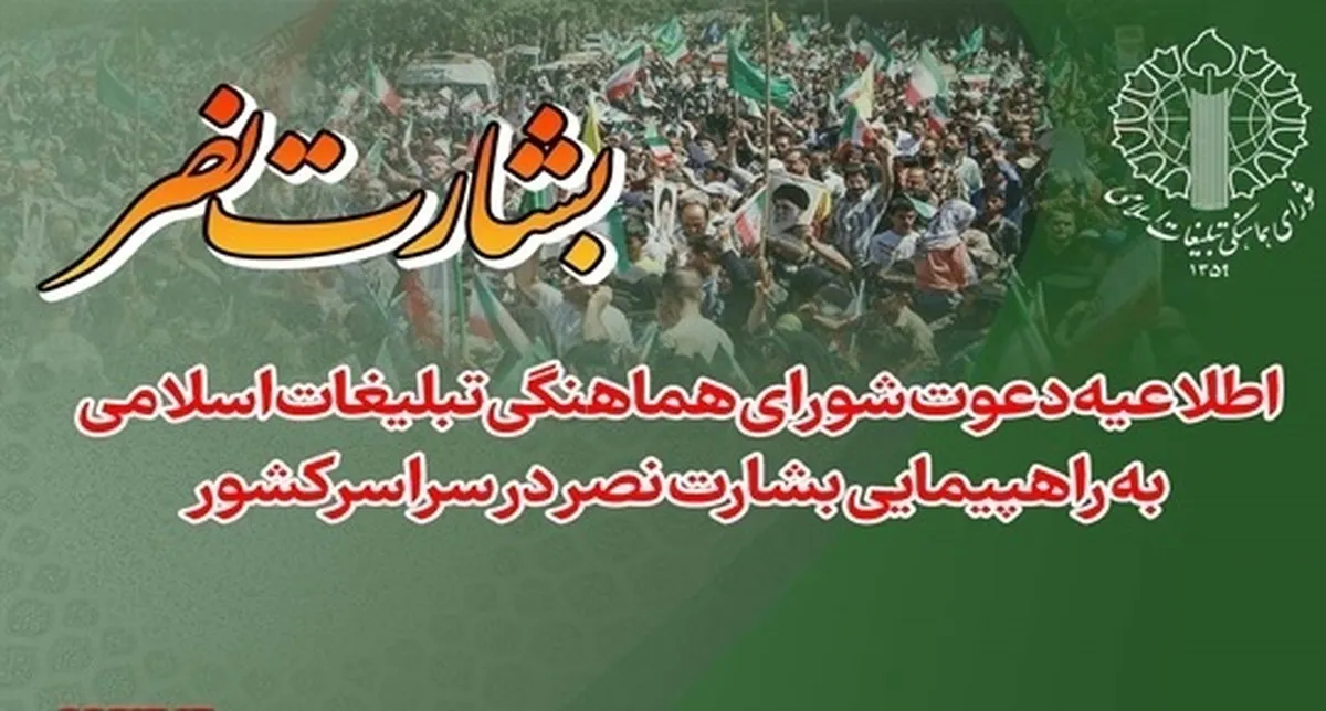 شورای هماهنگی تبلیغات اسلامی، ضمن گرامیداشت پایداری ملت قهرمان غزه، از عموم مردم مؤمن و آگاه ایران اسلامی در تمامی استان‌ها دعوت می‌نماید تا در راهپیمایی سراسری «بشارت نصر»، پس از اقامه نماز عبادی‌ـ‌سیاسی جمعه ۱۸ مهرماه ۱۴۰۴، حضور یابند.