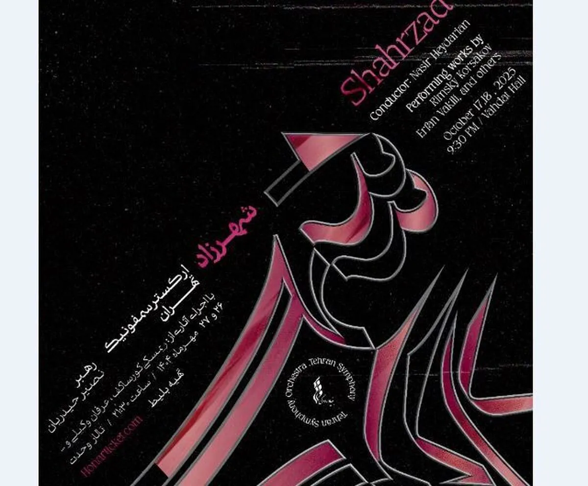 کنسرت ارکستر سمفونیک تهران با عنوان «شهرزاد» به رهبری نصیر حیدریان در تاریخهای ۲۶ و ۲۷ مهرماه ۱۴۰۴ ساعت ۲۱:۳۰ در تالار وحدت برگزار میشود. علاقهمندان میتوانند برای تهیهی بلیت این برنامه به سایت هنر تیکت مراجعه کنند.