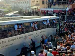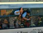 مردم در انتظار رسیدن اتوبوسهای اسرای زندانی در فضایی جشنگونه هستند.