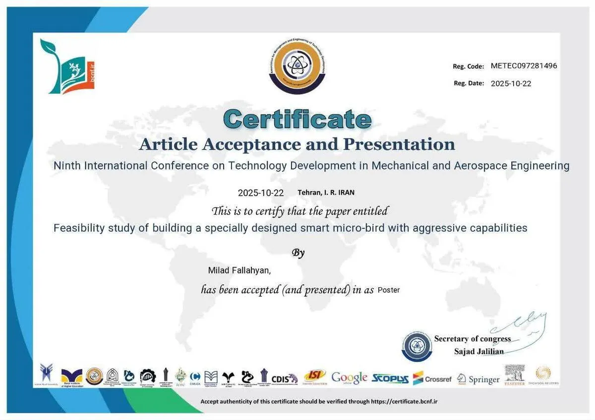 به گزارش خبرنگار آنا، مقاله میلاد فلاحیان دانشآموخته کارشناسی ارشد مهندسی مکانیک دانشگاه آزاد اسلامی واحد شاهرود در کنفرانس بینالمللی «توسعه فناوری در مهندسی مکانیک و هوافضا تهران» پذیرفته و ارائه شد.