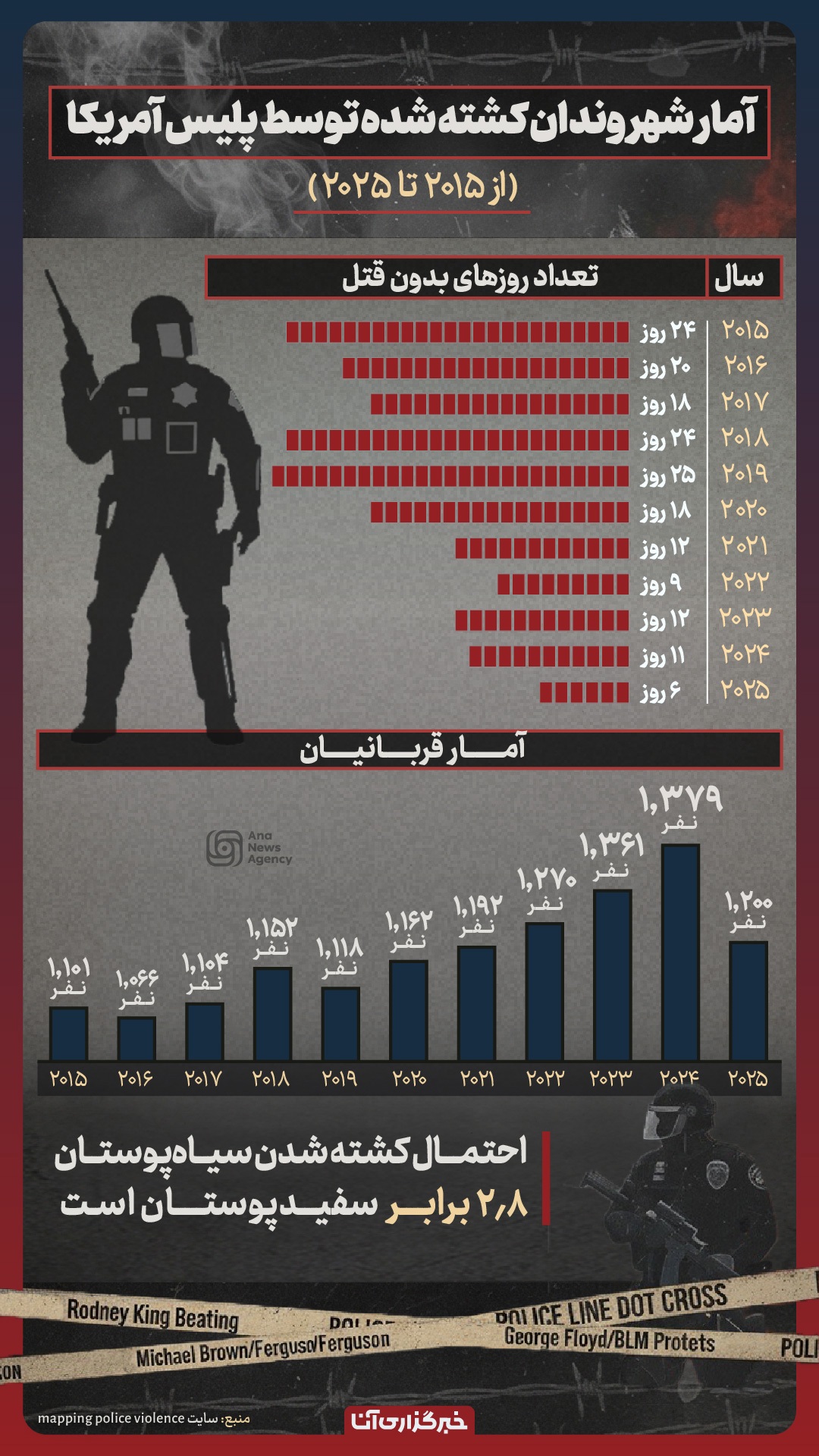در دهه گذشته، پلیس آمریکا به طور میانگین هر ۸ ساعت یک شهروند را کشته است. آمارها روندی مرگبار و نژادپرستانه را نشان میدهند: تعداد قربانیان از ۱۱۰۱ نفر در ۲۰۱۵ به ۱۲۰۰ نفر در ۲۰۲۵ رسیده و سیاهپوستان ۲.۸ برابر بیشتر در معرض خطرند. اما هشداردهندهترین رقم، تعداد روزهای بدون قتل است: از ۲۴ روز در ۲۰۱۵ به تنها ۶ روز در ۲۰۲۵ سقوط کردهاست. این یک تراژدی عادیشده و سیستماتیک است.
