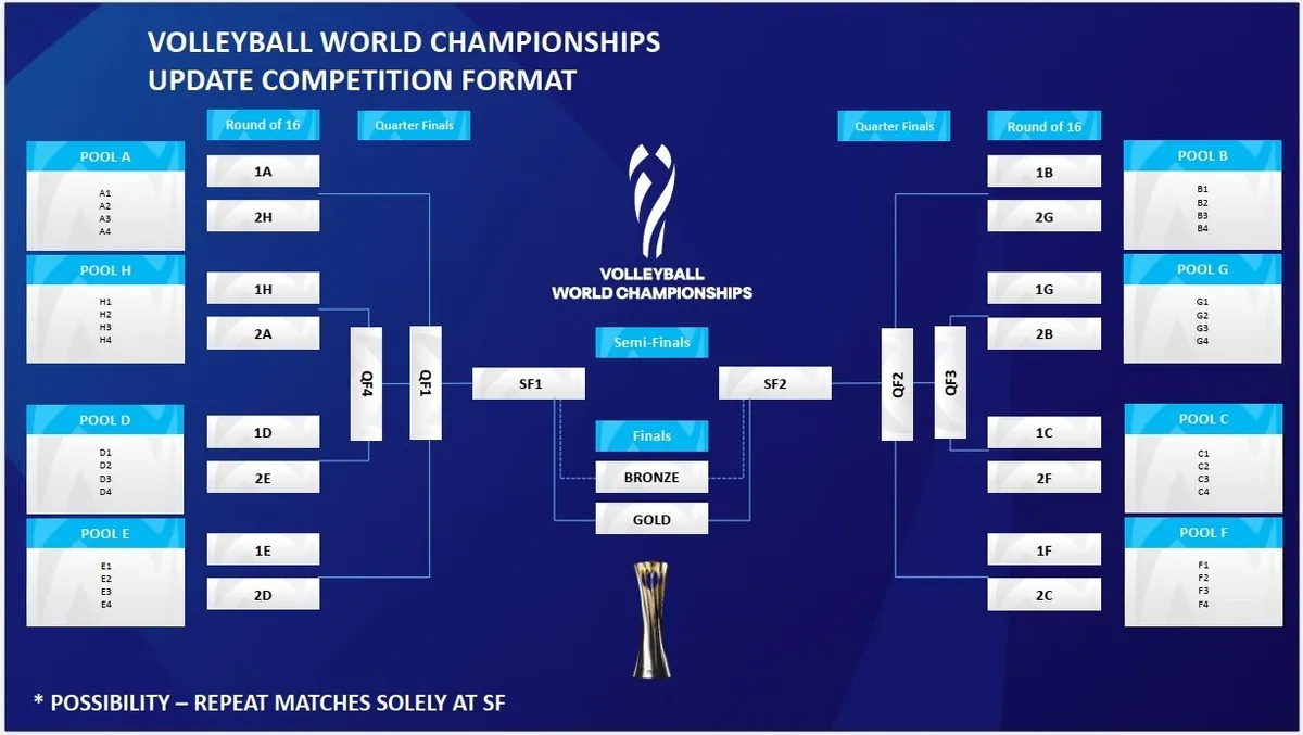 بر این اساس مسابقات والیبال قهرمانی جهان والیبال (FIVB World Championships) از سال ۲۰۲۷ به بعد با این فرمت برگزار خواهد شد که شامل تغییرات کلیدی است از جمله شفافیت و انصاف است به گونه ای که تیمها تا مرحله نیمهنهایی با تیمی که در گروهشان بوده دوباره بازی نکنند و از بازی تکراری جلوگیری شود.