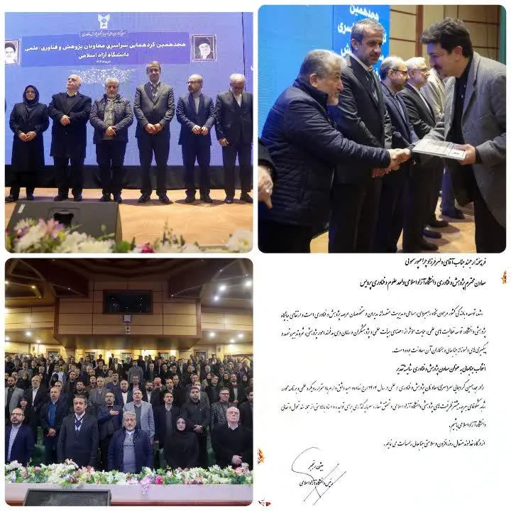 هجدهمین گردهمایی سراسری معاونان پژوهش و فناوری/علمی دانشگاه آزاد اسلامی کل کشور با حضور بیش از ۳۰۰ معاون پژوهش و فناوری واحدهای سراسر کشور، دکتر بیژن رنجبر رئیس عالیه دانشگاه، معاونان دانشگاه و مدیران کل معاونتهای تحقیقات، فناوری و نوآوری، علوم انسانی و هنر، و مهندسی و کشاورزی سازمان مرکزی طی سه روز در مرکز همایشهای غدیر واحد تهران مرکز برگزار شد.
