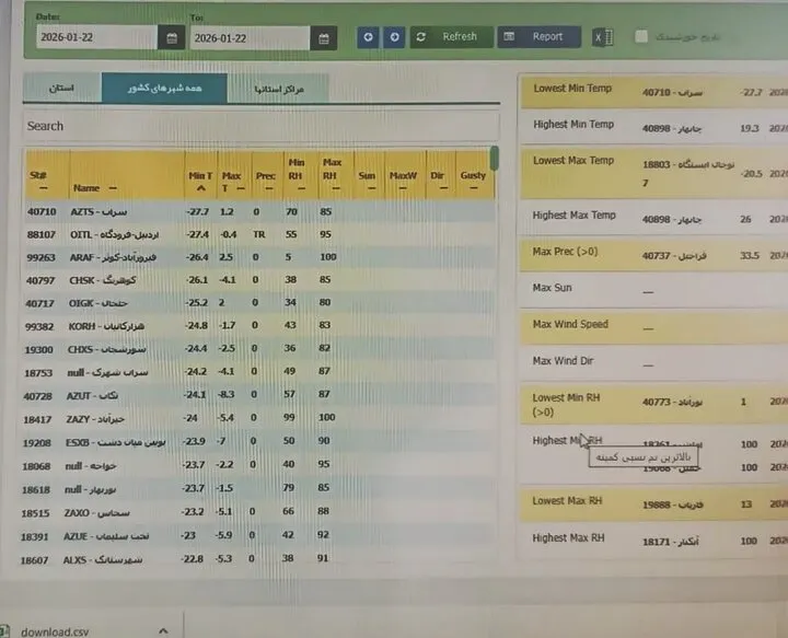رئیس گروه تحقیقات هواشناسی کاربردی آذربایجانشرقی اظهار کرد: در سحرگاه روز دوم بهمنماه ۱۴۰۴، دمای هوای شهرستان سراب به منفی ۲۸ درجه سانتیگراد رسید و این شهر عنوان سردترین ایستگاه کشور را به خود اختصاص داد.