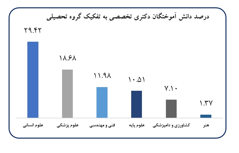 بنا بر این گزارش سهم گروه علوم انسانی از کل دانشجویان دوره دکتری تخصصی در سال تحصیلی ۱۴۰۴-۱۴۰۳ حدود ۴۳ درصد است که بیشترین سهم از کل دانشجویان را به خود اختصاص داده است. این در حالی است که دانشجویان دوره دکتری در گروه هنر تنها حدود ۷/۲ درصد کل دانشجویان دوره دکتری تخصصی را به خود اختصاص داده است.