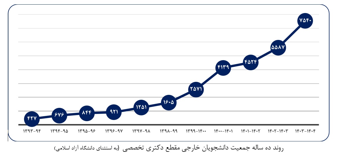 بنابراین گزارش؛ روند ۱۰ ساله تغییرات جمعیت دانشجویان بین المللی شاغل به تحصیل در مقطع دکتری تخصصی در دانشگاههای کشور در نمودار زیر آمده است. همانطور که در نمودار مذکور مشخص است، افزایش قابل ملاحظه ای در جمعیت دانشجویان بین المللی در آموزش عالی ایران را طی ۱۰ سال بوجود آمده است.