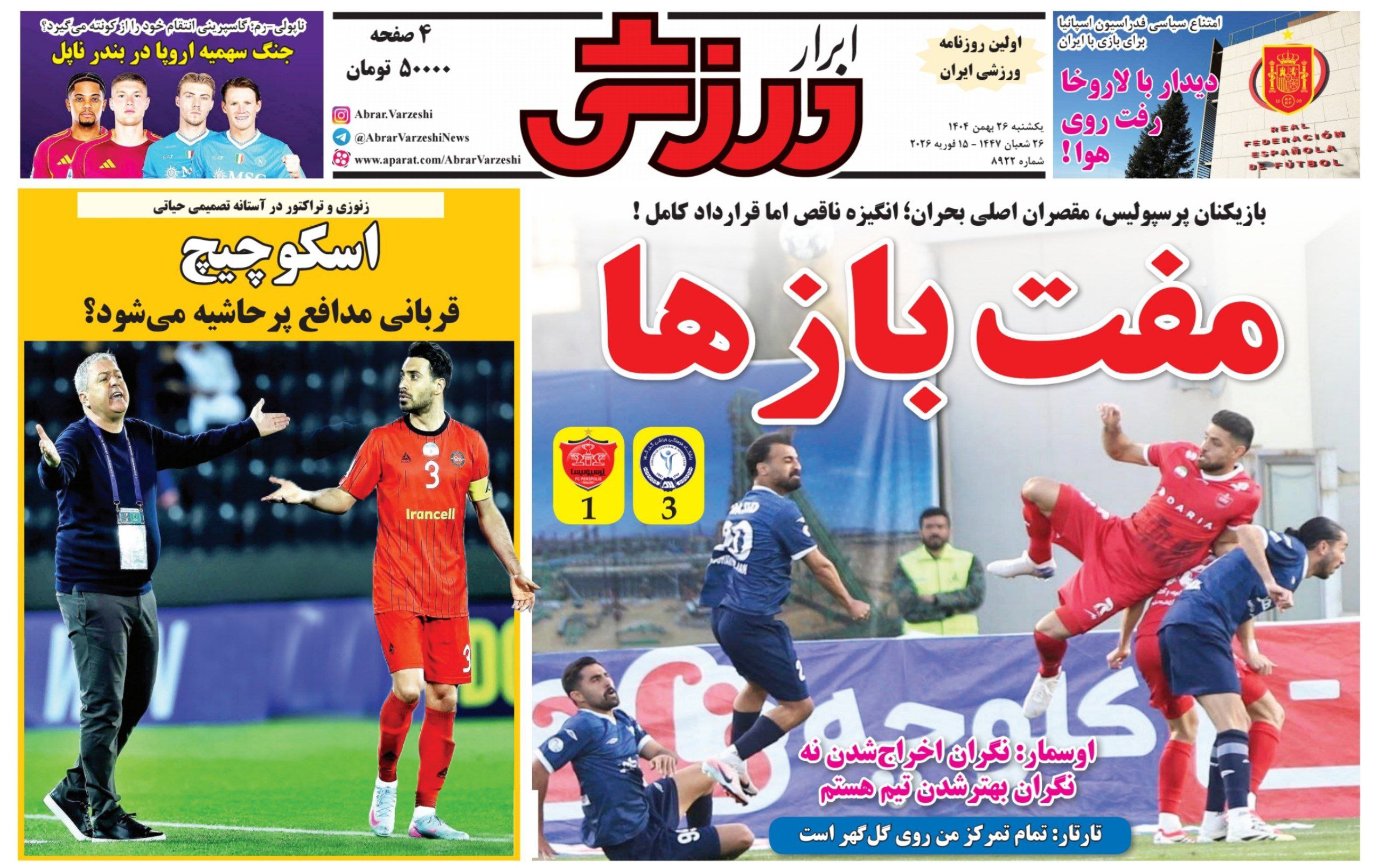 روزنامه های ورزشی یکشنبه 26 بهمن ماه 1404
