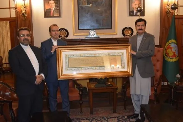 اهدای تابلوی نفیس قرآنی ایران به حکمران ایالت حیدر پختونخوا پاکستان