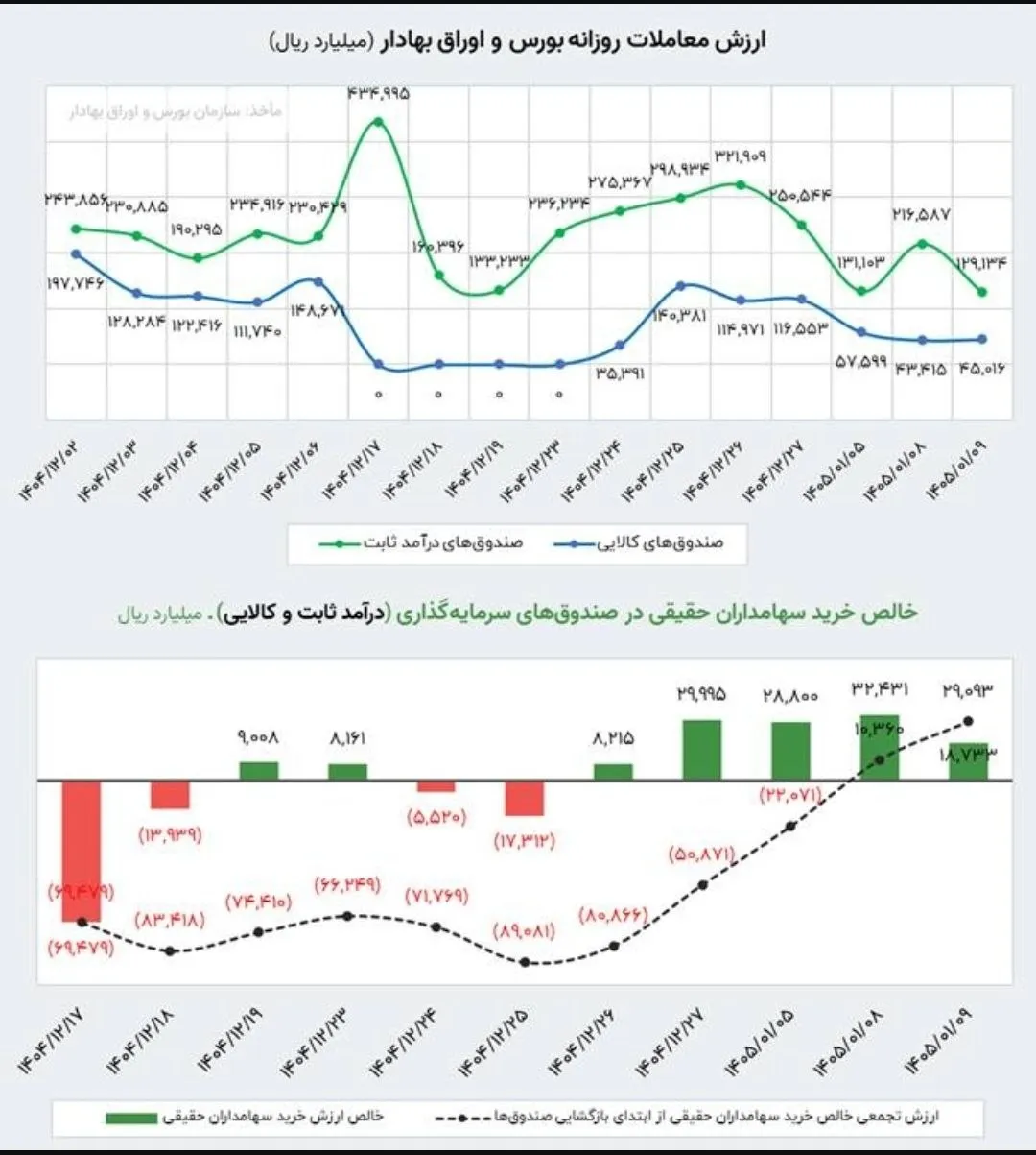 گزارش مدیریت پژوهش سازمان بورس نشان میدهد در معاملات امروز، ورود پول حقیقیها به صندوقهای درآمد ثابت افزایش یافت، این روند موجب شد خالص خرید سهامداران حقیقی در بازار از ابتدای بازگشایی، پس از جنگ تاکنون، به مثبت ۲.۹ همت برسد.