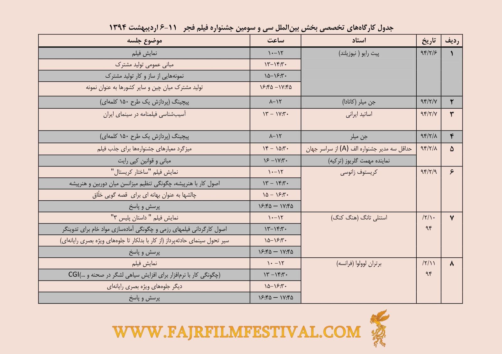 هشت کارگاه تخصصی سینمایی در حاشیه برپایی بخش بینالملل سی و سومین جشنواره فیلم فجر در سالن ۳ پردیس سینمایی ملت برگزار خواهد شد.
