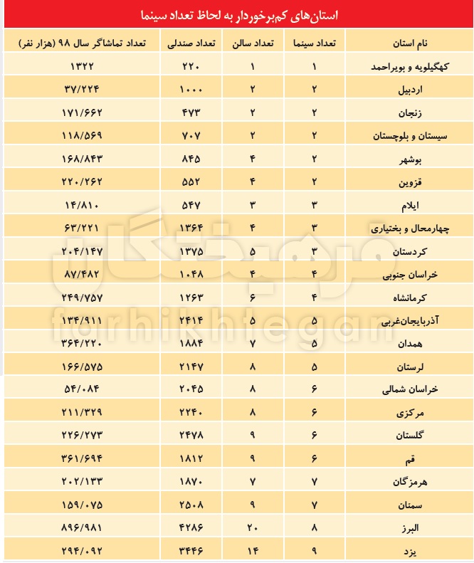 متاسفانه علیرغم نهضت سالنسازی طی سالیان اخیر که بیشتر متوجه تهران و کلانشهرها بوده، باید اعلام کنیم که از 31 استان کشور، 22 استان، کمتر از 10 سینما دارند. واضحتر بگوییم از این 22 استان، یک استان (یزد) 9 سینما دارد، یک استان (البرز) 8 سینما و 20 استان دیگر هم 1 تا 7 سینما دارند.کمبرخوردارترین استان سینمایی کشور، کهگیلویه و بویراحمد با تنها یک سینمای تکسالنه است که تنها 220 صندلی دارد. تعداد تماشاگران همین یک سینما در سال 98، 1322 نفر بوده است. استانهای اردبیل، زنجان و سیستانوبلوچستان، هریک 2 سینمای تکسالنه دارند. استان بوشهر و قزوین، 2 سینما با 4 سالن دارند.ایلام با 3 سینمای تکسالنه، هفتمین استان کمبرخوردار سینمایی کشور است. چهارمحالوبختیاری، 3 سینما با 4 سالن دارد. کردستان، 3 سینما با 5 سالن دارد. برخلاف خراسان رضوی که یکی از قطبهای اصلی و مهم سینمای کشور است، دو خراسان دیگر بهلحاظ سالن، وضعیت چندان مطلوبی ندارند؛ خراسان جنوبی 4 سینمای تکسالنه دارد. کرمانشاه هم 4 سینما دارد با 6 سالن. آذربایجانغربی، 5 سینمای تکسالنه دارد. همدان هم 5 سینما با 7 سالن دارد. لرستان هم از 5 سینما با 8 سالن برخوردار است. خراسان شمالی و مرکزی، 6 سینما با 8 سالن دارند. استانهای گلستان و قم نیز از 6 سینما با 9 سالن برخوردار هستند.استان هرمزگان، 7 سینمای تکسالنه دارد. سمنان هم از 7 سینما با 9 سالن بهرهمند است. استان البرز 8 سینما با 20 سالن دارد و یزد هم 9 سینما با 14 سالن دارد. متاسفانه 6 استان کشور هم هستند که زیر 1000 صندلی دارند؛ کهگیلویهوبویراحمد 220 صندلی، زنجان 473 صندلی، قزوین 552 صندلی، ایلام 547 صندلی، سیستانوبلوچستان 707 صندلی و بوشهر با 845 صندلی، کمترین میزان صندلیهای سینمایی کشور را بهخود اختصاص دادهاند.