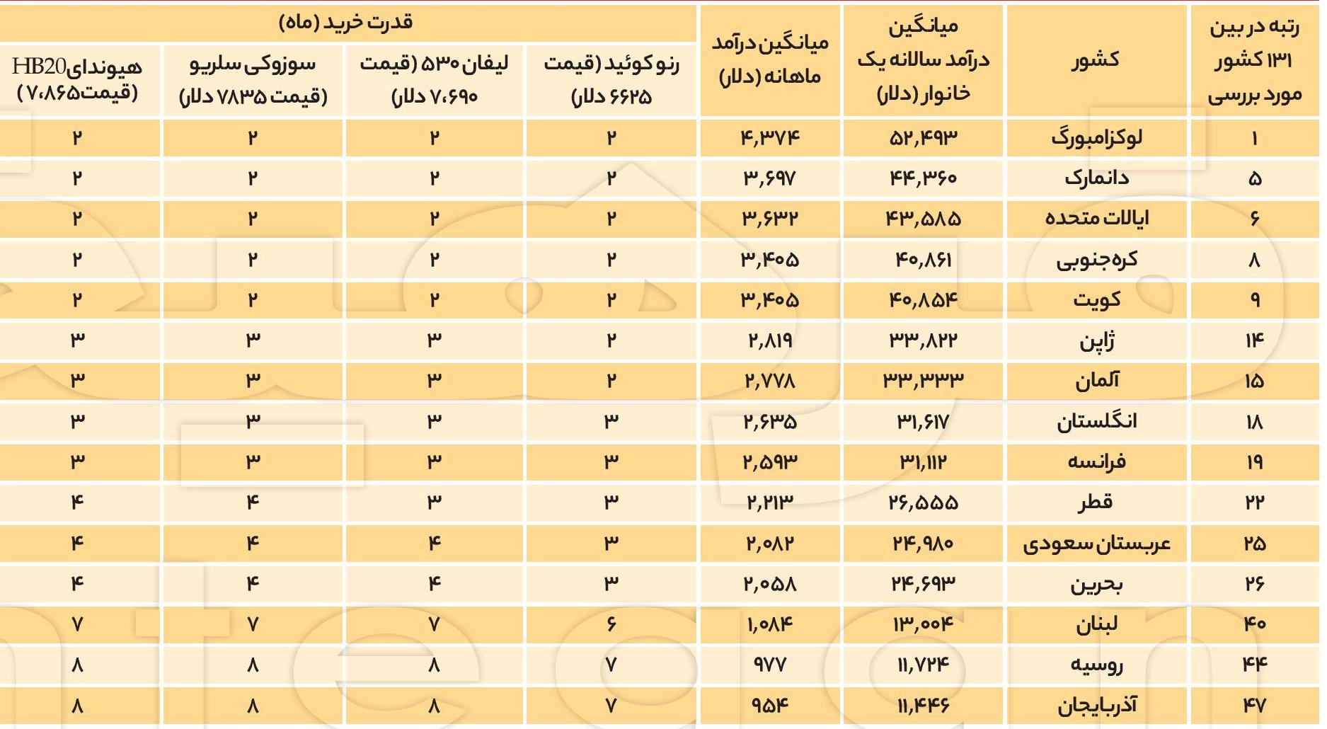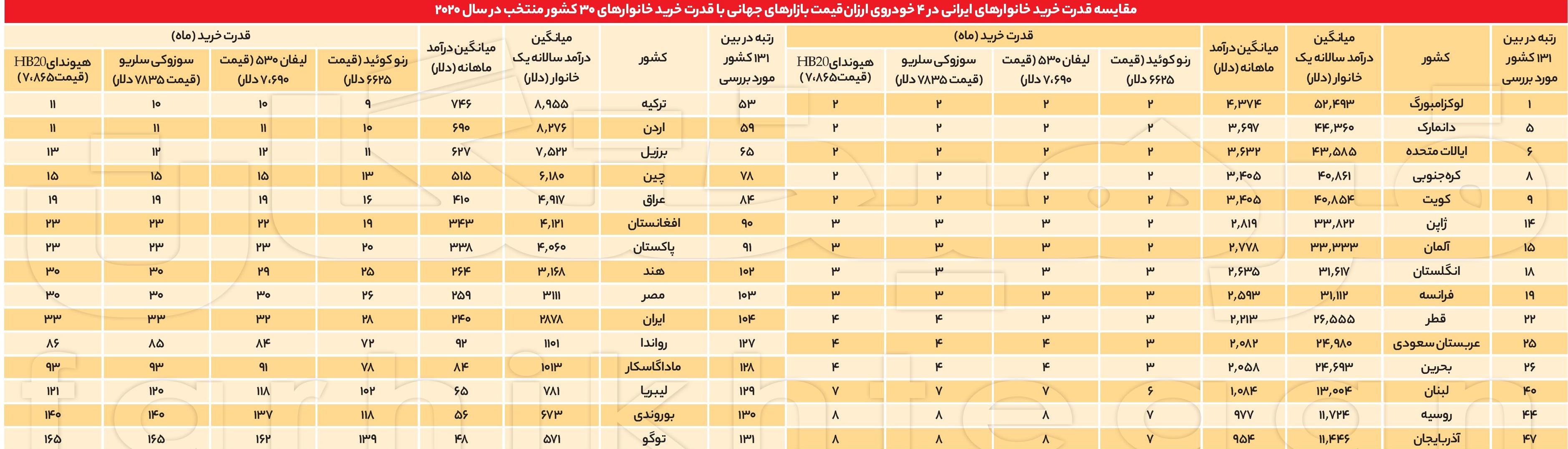 با این حساب خانوارهای ایرانی همانند درآمد سالانه، در قدرت خرید این خودروها نیز رتبه 104 را بین 131 کشور خواهند داشت. نکته قابلتامل اینکه کشورهایی که در وضعیت بدتر از ایران قرار دارند، عمدتا کشورهای کمدرآمد آفریقایی هستند و در انتهای جدول نیز، خانوارهای توگویی با 139 تا 165 ماه، بوروندیای با 118 تا 140 ماه، لیبریایی با 102 تا 121 ماه، ماداگاسکاری با 78 تا 93 ماه و خانوارهای رواندایی با 72 تا 86 ماه میتوانند صاحب چهار خودروی ارزان در بازارهای جهانی شوند و از این لحاظ پایینترین قدرت خرید خودرو را در بین این 131 کشور دارند.