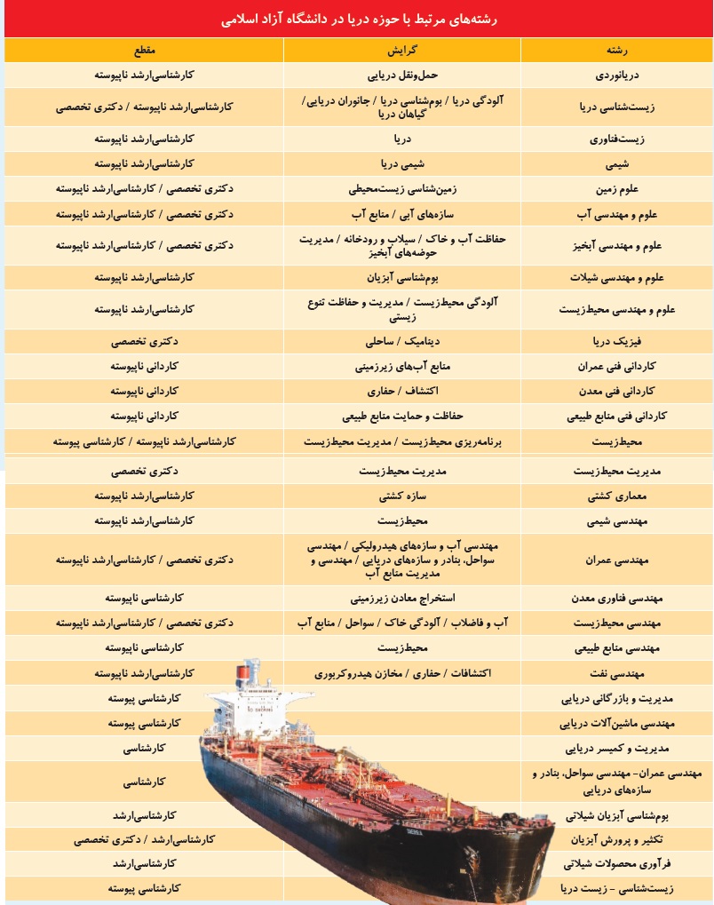 دانشگاه آزاد اسلامی در تلاش است تا این مشکل را نیز حل کند؛ بنابراین برنامهریزی برای آموزش و تدریس رشتهها متناسب با هر منطقه را نیز در دستورکار خود قرار داده است. در دانشگاه آزاد اسلامی 22 رشته وجود دارد که هر کدام به نحوی با حوزه دریا مرتبط هستند. رشتههایی که در مقاطع کارشناسیارشد ناپیوسته، دکتری تخصصی، کارشناسیارشد پیوسته، کاردانی ناپیوسته و کارشناسی ناپیوسته دانشجو میپذیرند. بنابراین میتوان امیدوار بود دانشگاه آزاد اسلامی با رشتهگرایشهای متنوعی که در این حوزه دارد بتواند به تولید دانش، پژوهش و فناوری در حوزه دریا کمک کند. همان ضعفی که دکتر طهرانچی از آن سخن گفته بود و حالا در این دانشگاه برای رفع این ضعف، برنامهریزیهای اساسی صورت گرفته است. در جدول زیر رشتهگرایشهایی که مرتبط با حوزه دریاست به تفکیک مشخص شده است.