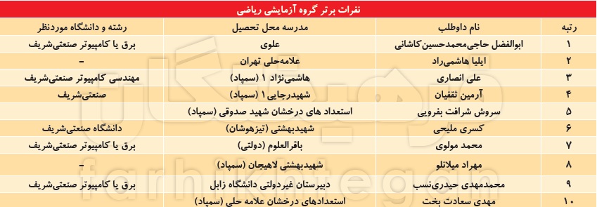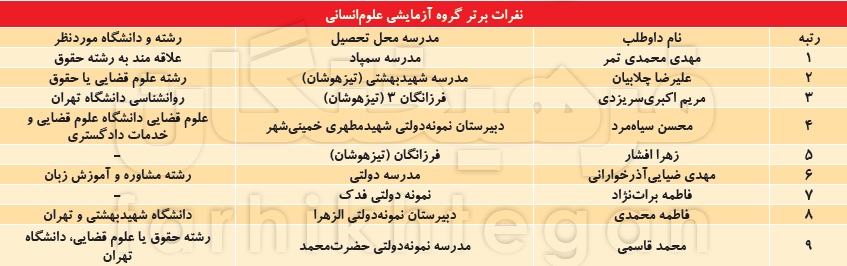 مساله جالبتر اینکه در میان برترینهای امسال داوطلبی از استان سیستانوبلوچستان است که توانسته رتبه نهم گروه آزمایشی علوم ریاضی را کسب کند و توانسته خود را درجمع 10 نفر اول این گروه آزمایشی جای دهد. همچنین رتبه هفتم این گروه آزمایشی نیز در مدرسهای کاملا دولتی درس خوانده؛ موضوعی که با توجه به اتفاقات چندسال اخیر و عدم حضور دانشآموزان این مدارس در نفرات برتر کنکور میتواند مسالهای امیدبخش برای دانشآموزان دولتی باشد.