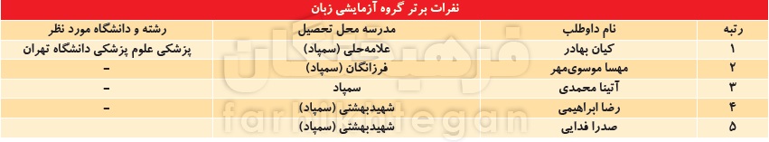 نکته قابلتامل درباره داوطلبان شرکتکننده در آزمون زبان این است که نهتنها اکثر آنها از رشتههای غیر از زبان در این آزمون شرکت کردهاند، بلکه بخش اعظم نفرات برتر نیز میخواهند در رشتههای غیرزبان در مراکز دانشگاهی به تحصیل بپردازند، جالبتر اینکه برخی نفرات گروه هنر از مشاوران بیرون از مدرسه کمک گرفتهاند، مسالهای که شاید در داوطلبان دیگر گروههای آزمایشی کمتر شاهد آن باشیم. رضا ابراهیمی، رتبه چهار کنکور زبان نیز با بیان اینکه دیپلم را در رشته تجربی و در مدرسه تیزهوشان شهید بهشتی گرفتهام، میگوید: «در روزهایی که در مدرسه حضور نداشتم تلاش میکردم از 10 ساعت کمتر درس نخوانم و هرچند کتابهای درسی محور اصلیام بود اما بیشتر وقتم را صرف تست زدن کردهام.»