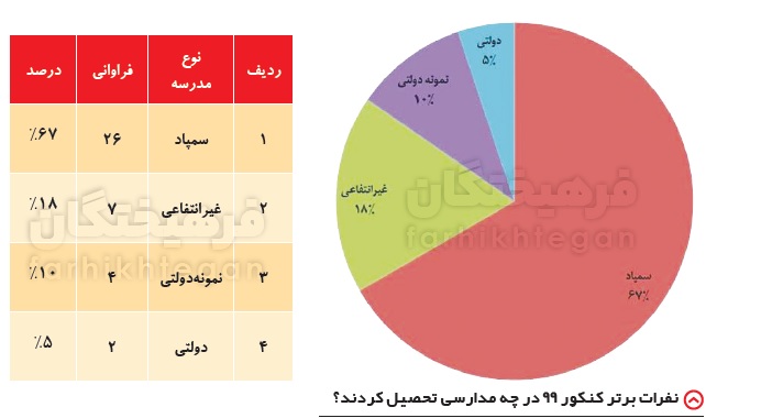 نکته قابلتامل درباره نفرات برتر کنکور امسال برخلاف داوطلبان سال گذشته، مدارس محل تحصیل آنهاست؛ چراکه سال گذشته تقریبا اکثر داوطلبانی که توانسته بودند در زمره 10 یا 5 نفر برتر گروههای مختلف آزمایشی قرار بگیرند، افرادی بودند که زمانی در مدارس غیرانتفاعی تحصیل میکردند، اما بهنظر میرسد امسال دانشآموزان سمپادی و تیزهوشان در میدان رقابت با غیرانتفاعیها، برگبرنده را در دست گرفتهاند و توانستهاند شاخ غول کنکور را بشکنند.
