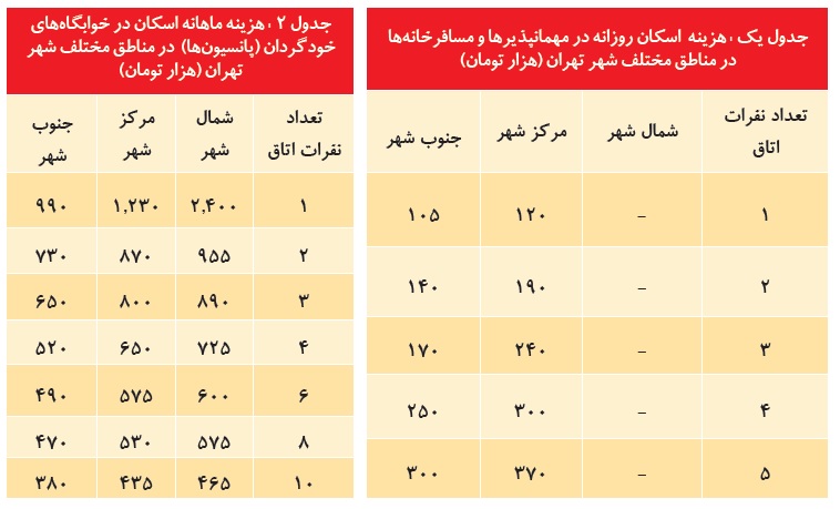 بررسیهای میدانی و اینترنتی قیمتهای ثبت شده مسافرخانهها، پانسیونها و هتلها نشان میدهند که شما برای یک شب اقامت در تهران به فراخور پایین یا بالا شهر بودن منطقه، بین 100 تا 650 هزار تومان هزینه اسکان خواهید داشت. همچنین براساس اجاره ماهانه خانهها باز هم براساس جنوب و شمال شهر بودن منطقه بین 50 تا 500 هزار تومان هزینه اسکان خواهید داشت.