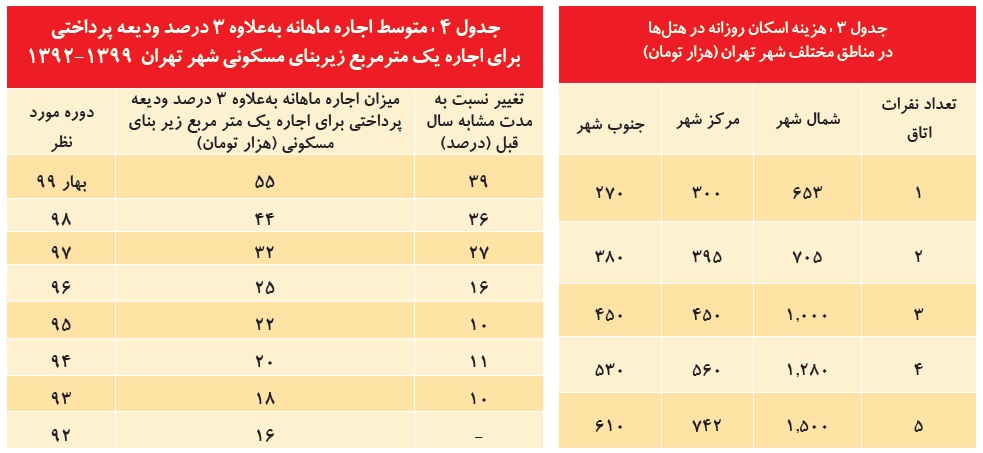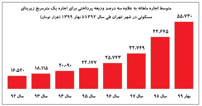 متوسط قیمت مسکن در شهر تهران در شهریور ماه 1399 حدود 23 میلیون و 500 هزار تومان بوده است که نسبت به ماه مشابه در سال 1398، حدود صد درصد رشد داشته است. این افزایش قیمت، بر افزایش نرخ اجارهبها نیز تاثیرگذار بوده است؛ بهطوری که، براساس آمارهای موجود، متوسط اجاره ماهانه بهعلاوه 3درصد ودیعه پرداخت برای اجاره یک مترمربع زیربنای مسکونی در بهار 99 در شهر تهران در مقایسه با مدت مشابه سال قبل 40 درصد رشد داشته و این درحالی است که نرخ اجارهبها با تاخیری زمانی نسبت به نرخ خرید و فروش مسکن افزایش پیدا خواهد کرد. بنابراین میتوان انتظار افزایش روزافزون اجاره خانهها را داشت.
