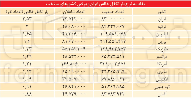 همانطور که در جدول جزئیات آن آمده، میانگین بار تکفل خالص درحالی در ایران 2.53 نفر است، یعنی هر شاغل بهجز خود وظیفه تامین مخارج معیشتی بیش از دو نفر را نیز برعهده دارد که این تعداد در ترکیه 2 نفر، در فیلیپین 1.65 نفر، در برزیل 1.6 نفر، در مکزیک 1.33 نفر، در فرانسه 1.21 نفر، در مالزی 1.13 نفر، در انگلیس نزدیک به یک نفر و در کشورهای کرهجنوبی و آلمان نیز کمتر از یک نفر است.