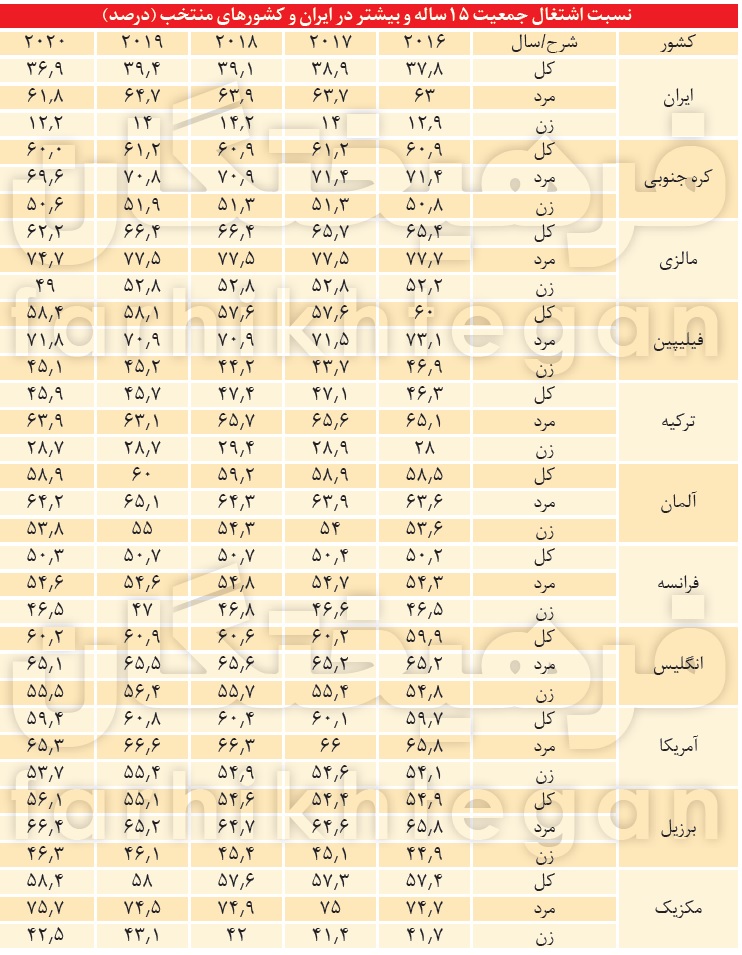 تا اینجا مشخص شد که نسبت اشتغال در ایران بهجز ترکیه، در مقایسه با اغلب این کشورها، معادل 50 درصد نسبت اشتغال در کشورهای منتخب است. با نگاهی به نسبت اشتغال در مردان و زنان، مشخص میشود پایین بودن میانگین نسبت اشتغال در ایران مربوط به پایین بودن نسبت اشتغال زنان است، چراکه درحالی نسبت اشتغال زنان ایرانی طی سالهای 2016 تا نیمه اول سال 2020 حدود 12 تا 14 درصد بوده که این نسبت در کرهجنوبی 50 تا 52 درصد، در مالزی 49 تا 52 درصد، در فیلیپین 45 تا 47 درصد، در ترکیه 28 تا 29 درصد، در آلمان 54 تا 55 درصد، در فرانسه 45 تا 47 درصد، در انگلیس 55 تا 56 درصد، در آمریکا 54 تا 55 درصد، در برزیل 45 تا 46 درصد و در مکزیک نیز این نسبت 42 تا 43 درصد بوده است.