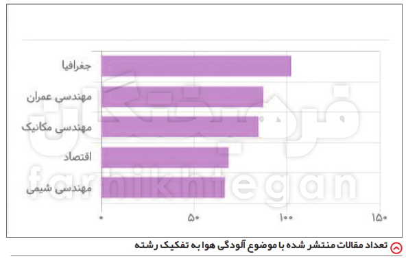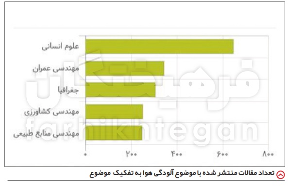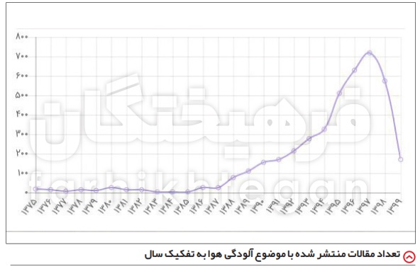 نکته قابلتوجه دیگر اینکه بررسی سالانه میزان مقالات منتشرشده با موضوع آلودگی هوا نشان میدهد از سال 1340 توجه دانشگاهیان به این مقوله جلب شد و از دهه 40 تا 80 بهطور میانگین سالانه 2 مقاله منتشر شده است. اما از ابتدای دهه 80 وضعیت متفاوت شد و جامعه آکادمیک کشور در اولین سال از این دهه 28 مقاله با این موضوع به چاپ رساند.