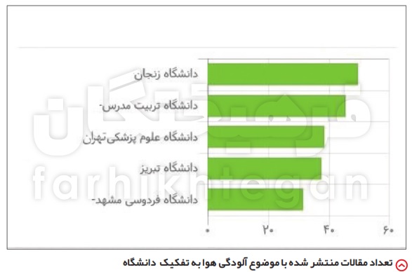 علیرغم اینکه آلودگی هوای تهران بهعنوان پایتخت کشور سالهای سال است که نفس تهرانیها را گرفته، اما دانشگاههای مستقر در این شهر آنطور که انتظار میرود نتوانستهاند در این زمینه فعالیت کنند. دانشگاه زنجان، اولین دانشگاهی است که بیشترین میزان فعالیتهای پژوهشی با موضوع آلودگی هوا را به خود اختصاص داده، بعد از آن دانشگاه تربیتمدرس، دانشگاه علوم پزشکی تهران، دانشگاه تبریز و فردوسی مشهد قرار دارد. همچنین دانشجویان و اساتید رشته جغرافیا، مهندسی عمران، مهندسی مکانیک و اقتصاد و مهندسی شیمی هم بیشترین فعالیت را در این زمینه داشتهاند.