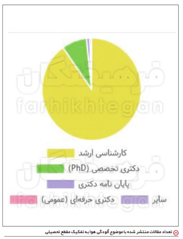 با نگاهی به سامانه گنج (پایگاه اطلاعات علمی ایران) میتوان به دادههای قابلتوجهی درباره فعالیتهای پژوهشی دانشگاهیان کشور با موضوع آلودگی هوا رسید، چراکه ماحصل حدود 100 سال فعالیت نهاد دانشگاه در کشور انتشار 4 هزار و 284 پایاننامه و رساله دکتری با موضوع آلودگی هوا بوده که بخش اعظم بار انجام فعالیت پژوهشی با این موضوع هم برعهده دانشجویان کارشناسیارشد با 3 هزار و 864 مقاله بوده است، البته دانشجویان دکتری تخصصی هم تا امروز 349 مقاله با این موضوع منتشر کردهاند که بعد از آنها دانشجویان دکتری با 46 مقاله و دانشجویان مقطع دکتری تخصصی (عمومی) با 23 رساله قرار دارند.