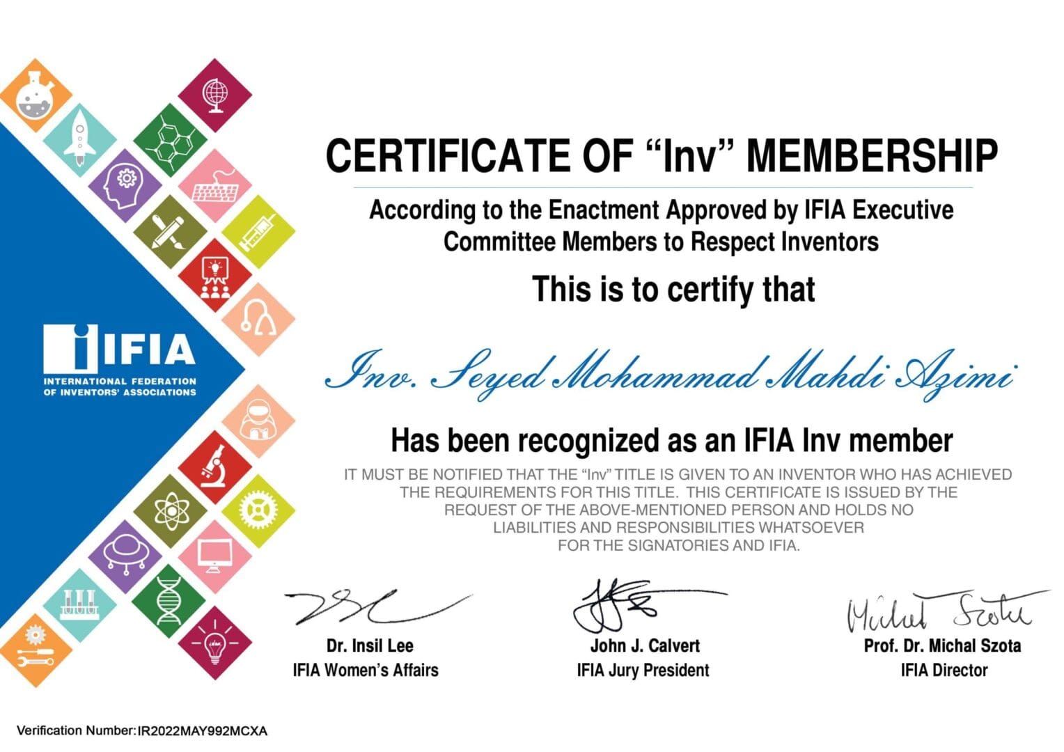 لازم به ذکر است، سرتیفیکت عضویت و نیز کد مختص این مخترع IR2022MAY992MCXA در وبسایت رسمی فدراسیون بینالمللی مخترعان ثبت شده است.