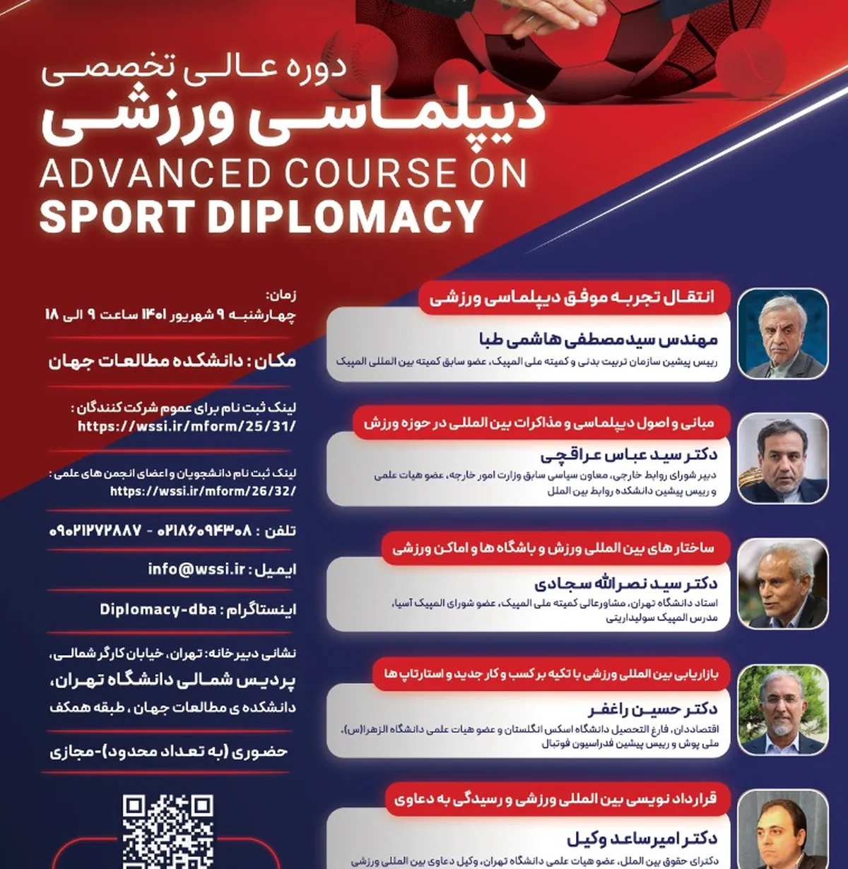 به گزارش گروه ورزش خبرگزاری آنا، دوره عالی «دیپلماسی ورزشی» توسط دانشکده مطالعات جهان دانشگاه تهران با موضوعات مختلف اعم از مبانی و اصول دیپلماسی و مذاکرات بین المللی در حوزه ورزش، ساختارهای بین المللی ورزش، باشگاهها و اماکن ورزشی، انتقال تجارب موفق دیپلماسی ورزشی، بازاریابی ورزشی مبتنی بر کسب و کار جدید و استارتاپ ها، قرارداد نویسی و رسیدگی به دعاوی حقوقی برگزار میشود.