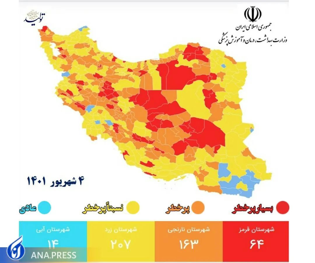 به گزارش گروه جامعه خبرگزاری آنا، مرکز روابط عمومی و اطلاع رسانی وزارت بهداشت اعلام کرد، بر اساس آخرین به روز رسانی ها، تعداد شهر‌های با وضعیت قرمز کرونایی از ۱۰۶ به ۶۴ شهر کاهش و تعداد شهر‌های با وضعیت نارنجی از ۱۵۶ به ۱۶۳ شهر افزایش یافت.