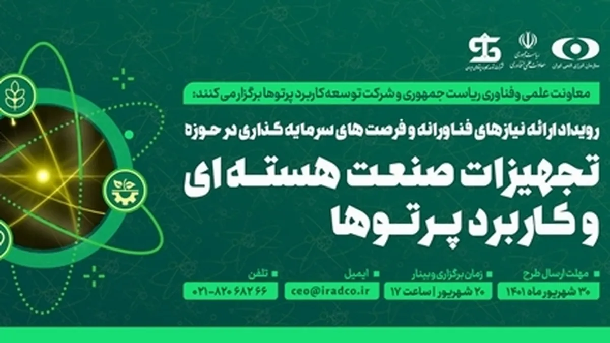 رویداد ارائه نیاز‌های فناورانه و فرصت‌های سرمایه‌گذاری در حوزه تجهیزات صنعت هسته‌ای و کاربرد پرتو‌ها ۲۰ شهریورماه سال ۱۴۰۱ برگزار می‌شود.