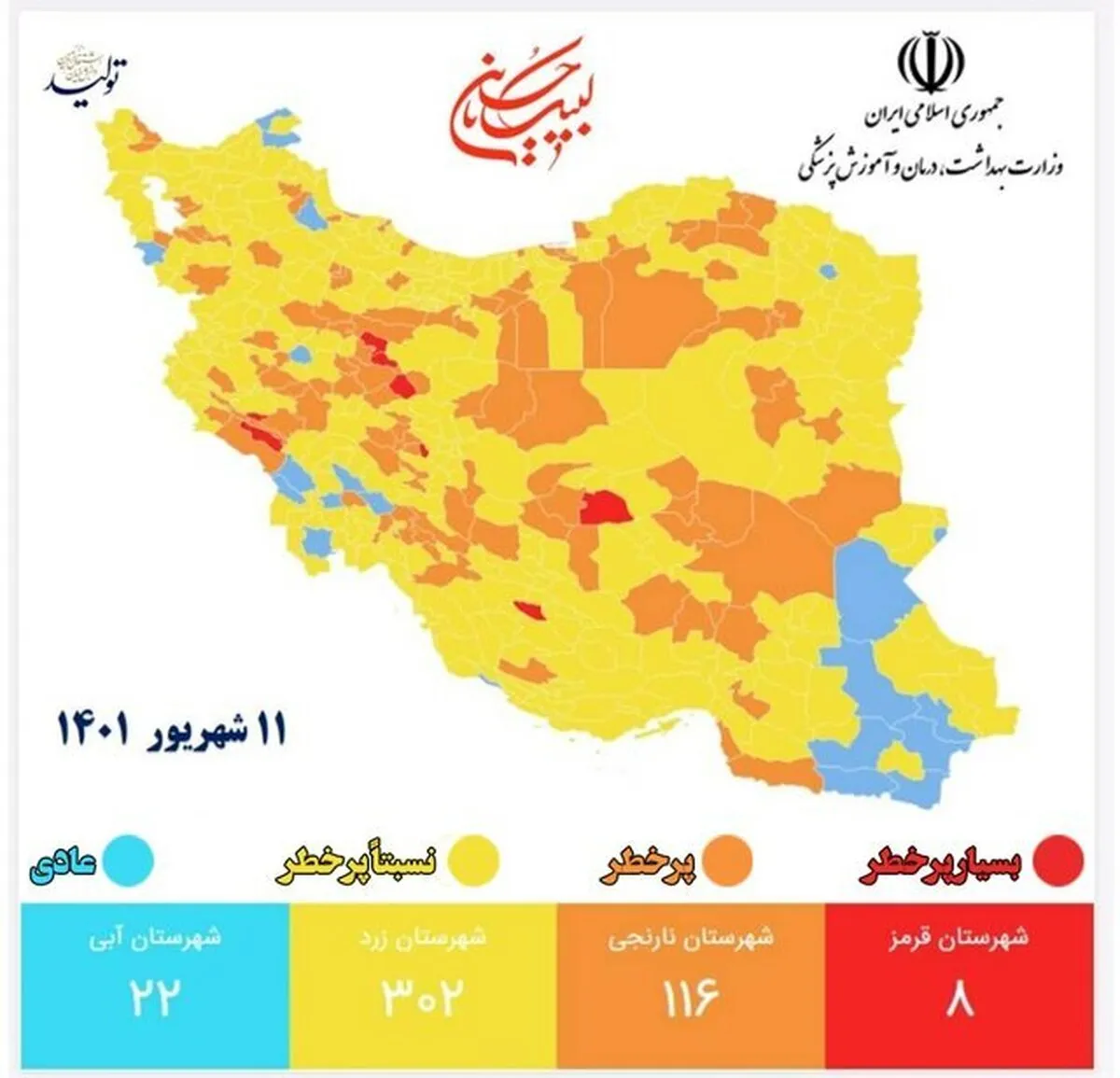 بنابر اعلام وزارت بهداشت در حال حاضر ۸ شهر در وضعیت قرمز، ۱۱۶ شهر در وضعیت نارنجی، ۳۰۲ شهر در وضعیت زرد و ۲۲ شهر در وضعیت آبی قرار دارند.