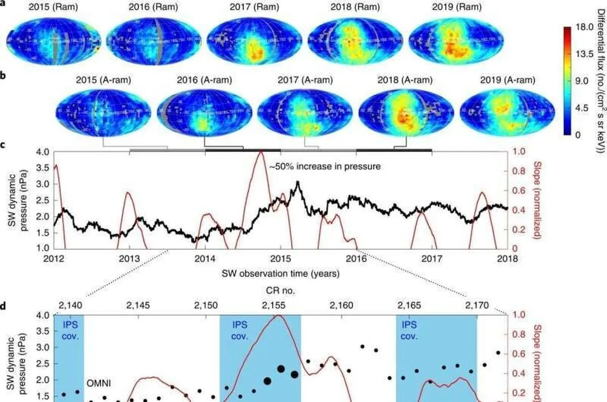 محققان با تجزیه و تحلیل داده های هر سه منبع، متوجه تغییر ناگهانی فشار ناشی از بادهای خورشیدی در سال ۲۰۱۴ شدند و از این رویداد در مقیاس زمانی نسبتاً کوتاهی برای مطالعه شکل هلیوپاز و ضربه خروجی استفاده کردند. آنها توانستند اتمهای خنثی پرانرژی را که هنگام برخورد بادهای خورشیدی با بادهای بینستارهای به وجود میآیند، اندازهگیری کنند.