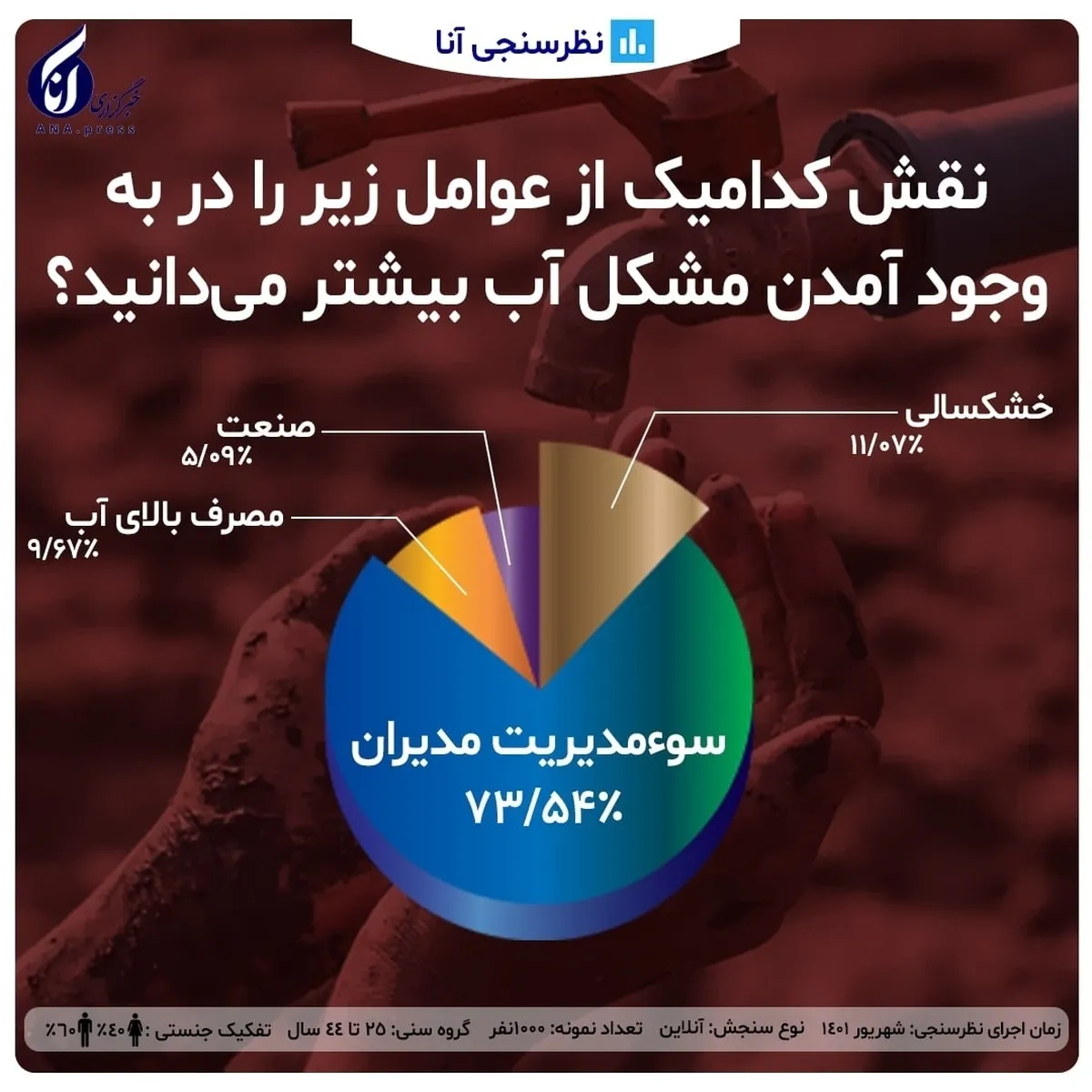 بر اساس نظرسنجی خبرگزاری آنا، مخاطبان از بین چهار گزینه خشکسالی، سوءمدیریت مدیران، مصرف بالای آب و صنعت، سوءمدیریت مدیران را با بیش از ۷۱ درصد به عنوان علت مشکل آب عنوان کردند.