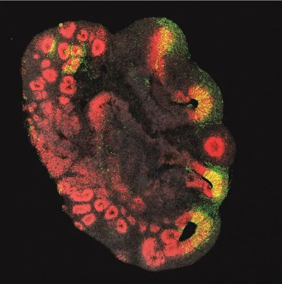 بخشی از یک ارگانوئید مغز ساخته شده از سلول‌های بنیادی یک انسان. در سرخابی سلول‌های بنیادی مغز به طور فعال تکثیر می‌شوند و در زرد زیر مجموعه‌ای از سلول‌های بنیادی مغز