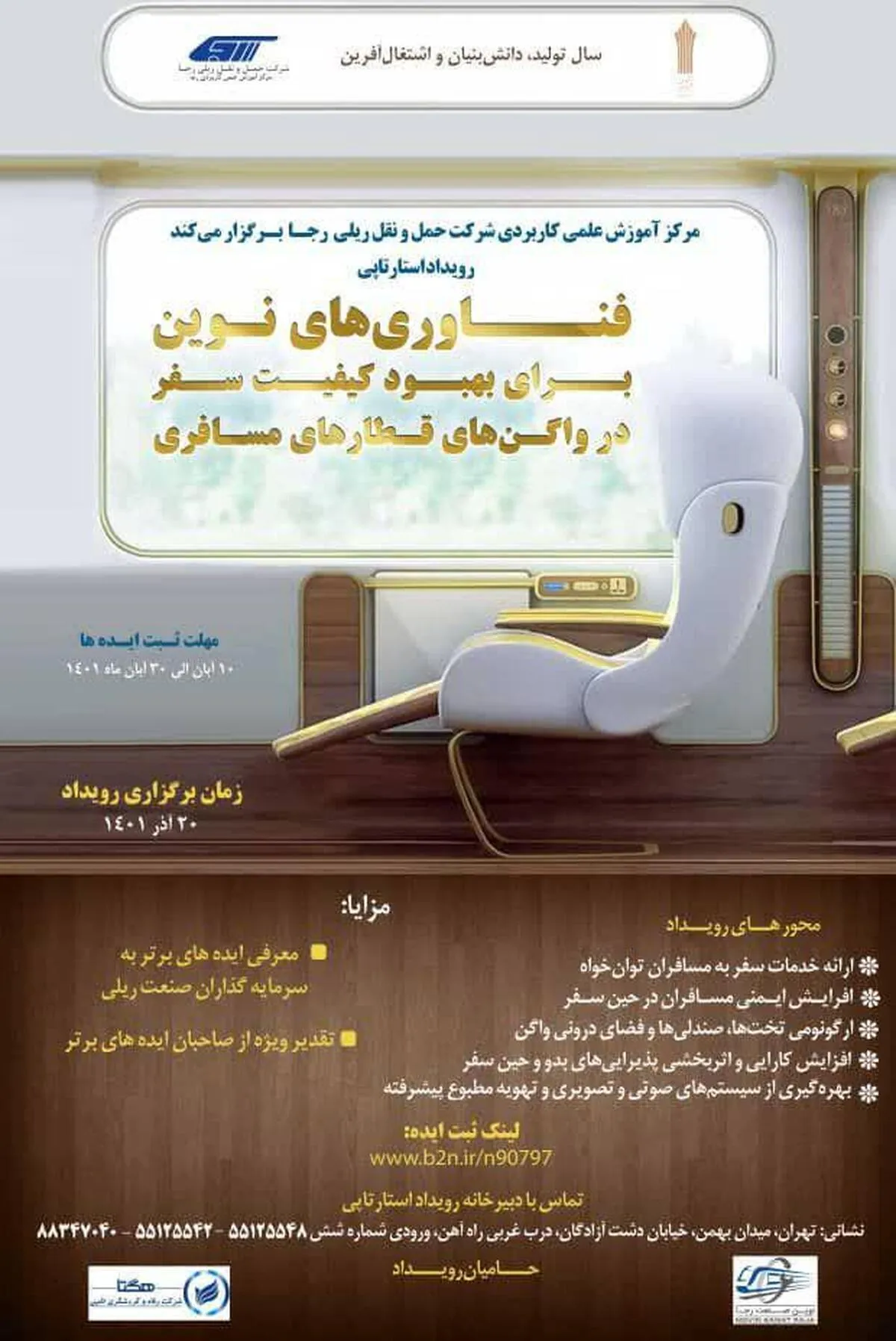 مدیر کل توسعه سرمایههای انسانی رجا با اعلام این خبر گفت: از کلیه صاحبان ایده، نواندیشان و نخبگان صنعت حملونقل ریلی دعوت میشود تا ایدههای خود را با موضوعات ارائه خدمات سفر به مسافران توانخواه، بهرهگیری از سیستمهای صوتی و تصویری پیشرفته (بستر اینترنت پرسرعت، ماهواره و ...)، سیستم تهویه مطبوع در واگن، کاهش آلودگی صوتی، افرایش ایمنی مسافران در حین سفر، ارگونومی تختها، صندلیها و فضای درونی واگن و افزایش کارایی و اثربخشی پذیراییهای بدو و حین سفر، به آدرس اینترنتی زیر ارسال کنند: