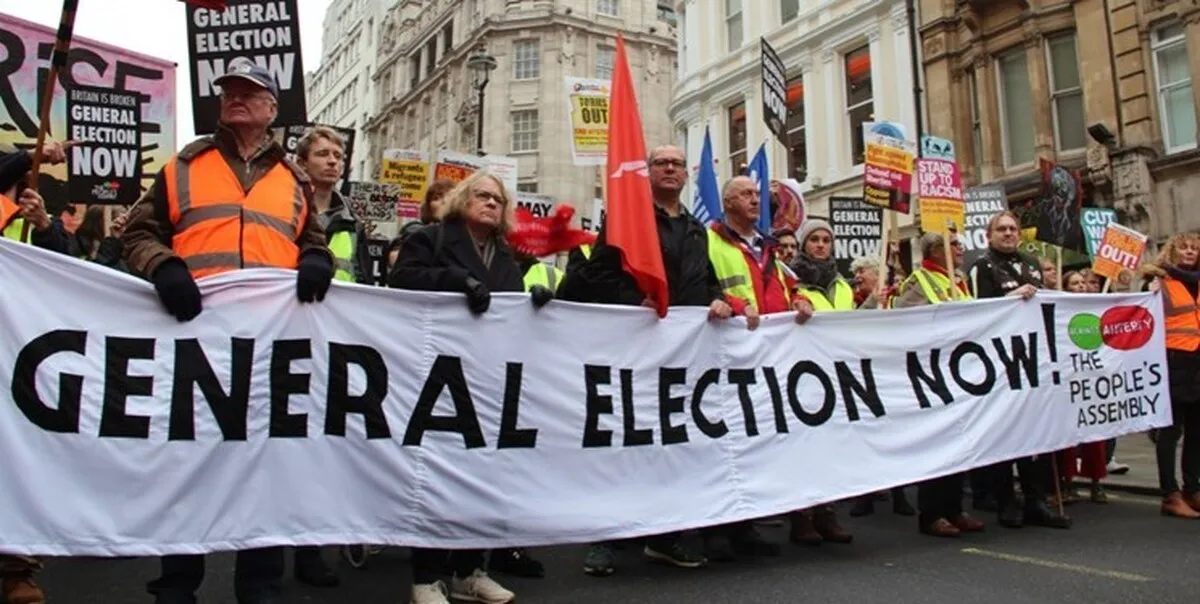 هزاران نفر از مردم انگلیس شنبه (پنجم نوامبر) به راهپیمایی اعتراضی در مرکز لندن پیوستند و خواستار برگزاری انتخابات سراسری شدند.