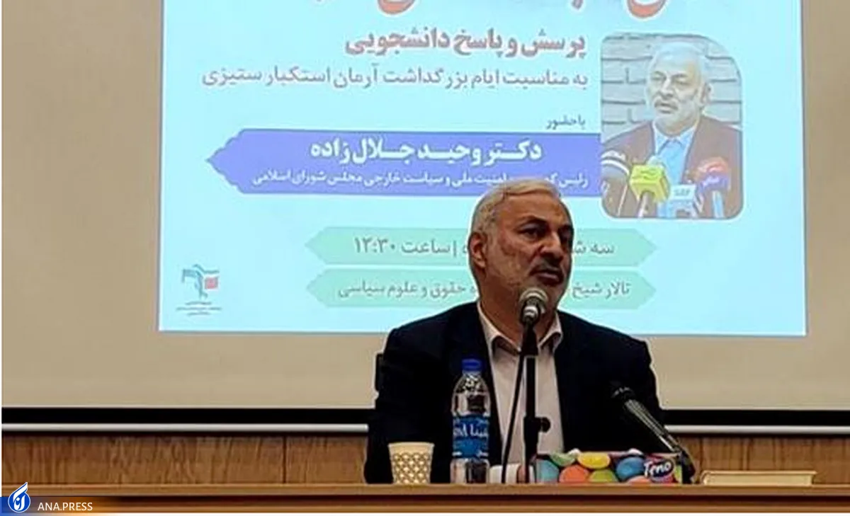 به گزارش گروه سیاست و حکمرانی خبرگزاری آنا، وحید جلال زاده رئیس کمیسیون امنیت ملی و سیاست خارجی مجلس شورای اسلامی ظهر سهشنبه (۱۸ آبان ماه) در جلسه پرسش و پاسخ دانشجویی که از سوی بسیج دانشجویی دانشکده حقوق و علوم سیاسی دانشگاه تهران به مناسبت ایام بزرگداشت آرمان استکبارستیزی با عنوان «صدای دانشجو، صدای حقیقت» در تالار شیخ انصاری این دانشکده برگزار شد، طی سخنانی به ارائه تاریخچهای از روند مذاکرات هستهای ایران با غرب پرداخت و گفت: غرب و در واقع آمریکا پس از آنکه از برجام خارج شد از آنجا که مشاهده کرد قادر به توقف پیشرفتهای ما نیست، تصمیم به اجرای مکانیزم ماشه گرفت، اما در اینجا برای نخستین بار در تاریخ روابط بینالملل اروپا با آمریکا همراهی نکرد و به نوعی خواست آمریکا را وتو کرد و رأی نداد؛ در نتیجه آمریکا نتوانست مکانیزم ماشه را علیه ما فعال کند.