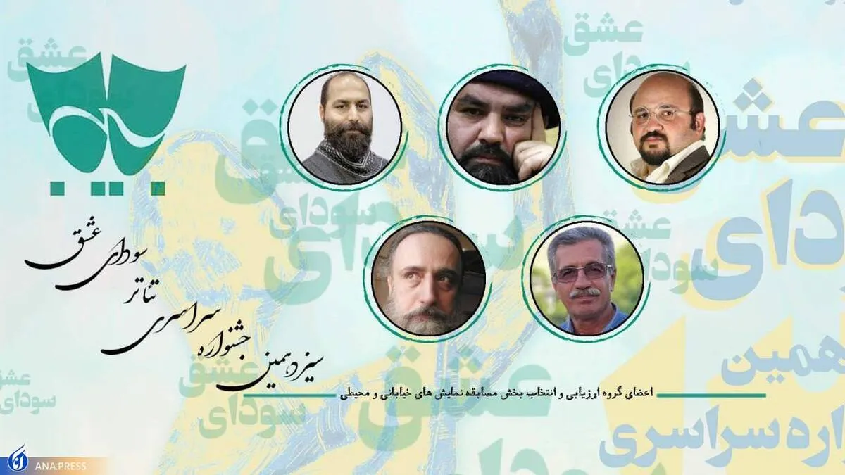 بر این اساس «سامان خلیلیان» کارگردان و تهیه کننده تئاتر و مدیر فرهنگی ، «داریوش نصیری» نویسنده بازیگر و کارگردان تئاتر و مدرس دانشگاه ، «علیرضا مصلح تهرانی« کارگردان و مدرس تئاتر و مدیر فرهنگی، «حجت علیخانی» کارگردان تئاتر، مدرس و فعال فرهنگی و «حسین احمدخانی» نویسنده ، کارگردان و بازیگر تئاتر، 64 اثر معرفی شده در بخش مسابقه نمایش های خیابانی و محیطی به دبیرخانه را مورد ارزیابی قرار داده و مطابق فراخوان جشنواره، 12 تا 15 اثررا به بخش نهایی مسابقه نمایشهای خیابانی سیزدهمین جشنواره سراسری تئاتر سودای عشق معرفی می کنند.